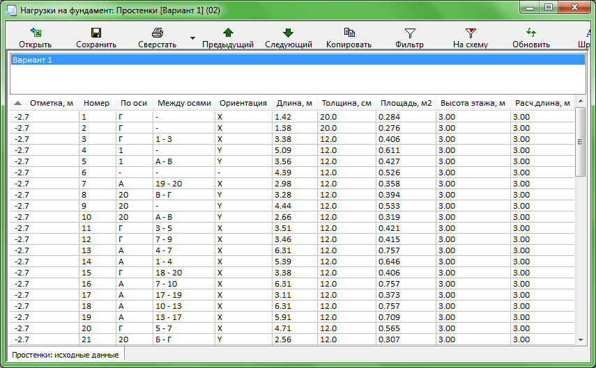 - таблицы характеристик простенков для сбора усилий, описывающие их геометрию.