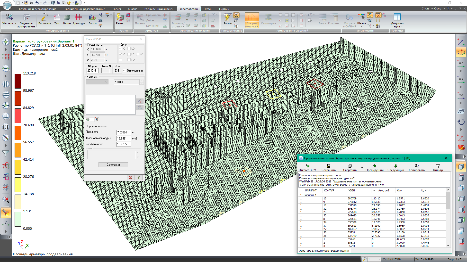 В результате расчета можно посмотреть вычисленные усилия продавливания, площадь требуемой поперечной арматуры и коэффициент запаса. Результаты расчета представлены в графическом и табличном видах.