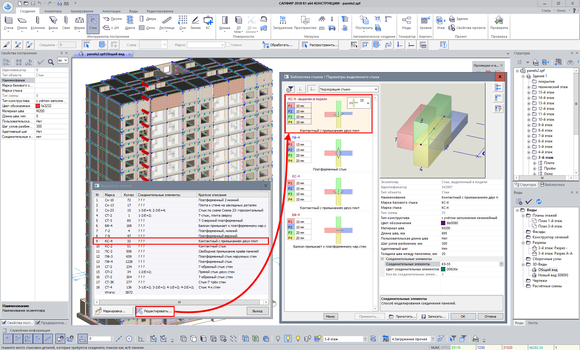 Разработан инструмент автоматической маркировки стыков по выбранным свойствам: схема соединения панелей, конструктивное представление стыка, вариант размещения и настройки соединительных деталей, длина стыка.
