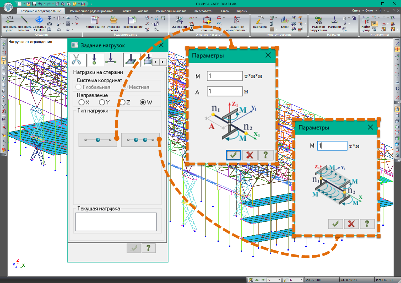 Жесткостные характеристики, соответствующие «определяющему нагружению», определяются на основе шагового метода для физически нелинейной конструктивной схемы, в том числе имеющей заданное армирование. Расчет на все последующие статические и динамические нагружения выполняется по традиционной технологии (с последующим составлением РСУ и РСН) для расчетной схемы с жесткостными характеристиками, соответствующими касательному модулю деформации для последнего шага расчета на определяющее нагружение.