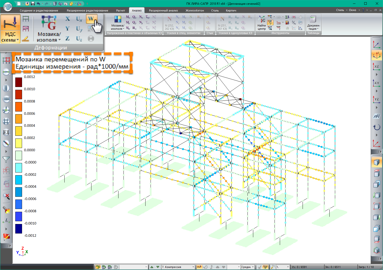 Результаты расчетов тонкостенных стержневых конструкций представлены в графической форме - в виде мозаик депланации в узлах расчетной схемы, а также эпюр и мозаик бимоментов на элементах схемы.