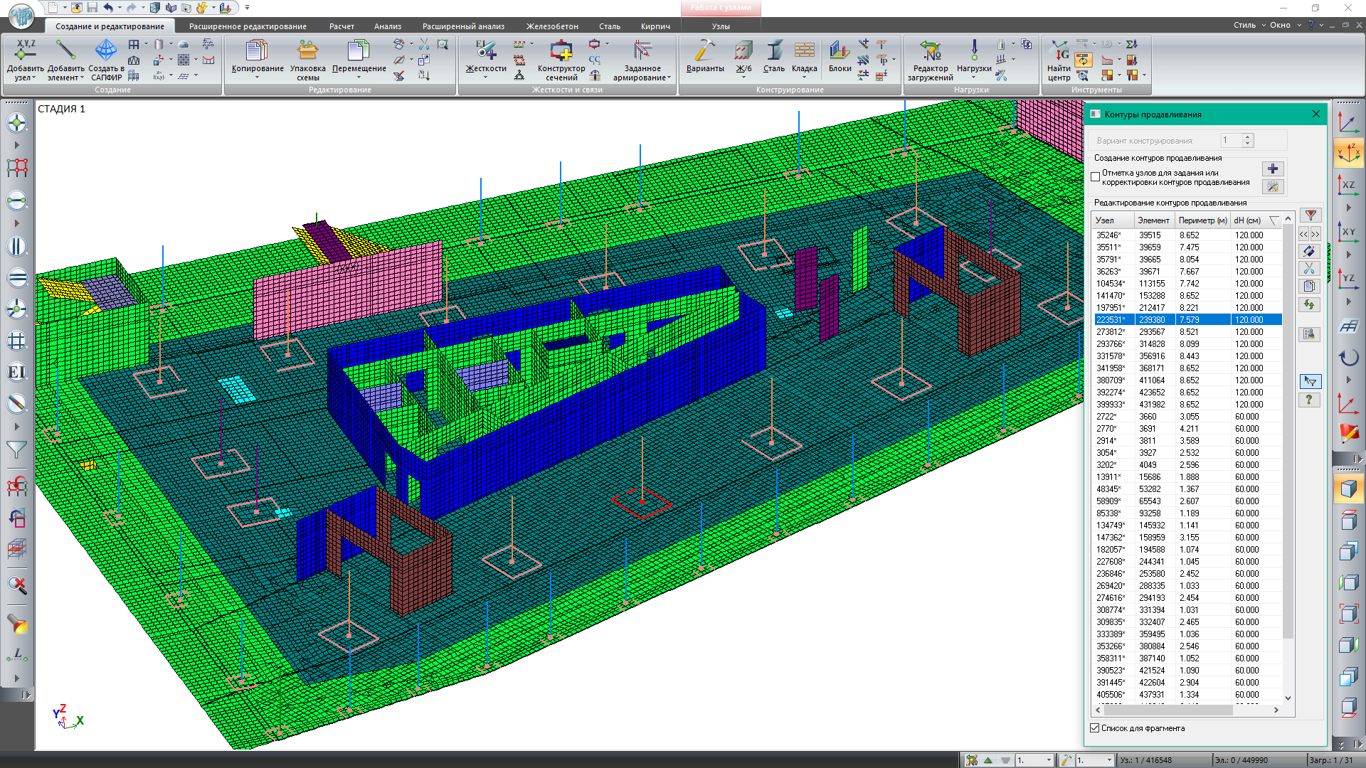 Реализован подбор требуемой поперечной арматуры в зонах опирания колонн/пилонов на фундаментную плиту/ростверк, а также опирания колонн на междуэтажное перекрытие. В случае подключения в расчетную модель грунтового основания, продавливающая сила разгружается реактивным отпором грунта. Для контроля и наглядности в программе САПФИР можно отобразить грузовой контур, который использовался для сбора реакций с элементов фундаментной плиты/ростверка.