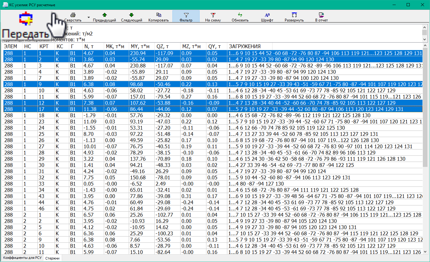 Для вычисления напряжений в любом сечении стержневого элемента расчетной схемы на основании статического/динамического расчетов добавлена возможность передачи усилий/РСН/РСУ в КС-САПР с помощью интерактивных таблиц «Книги Отчетов». Количество строк не ограничено.