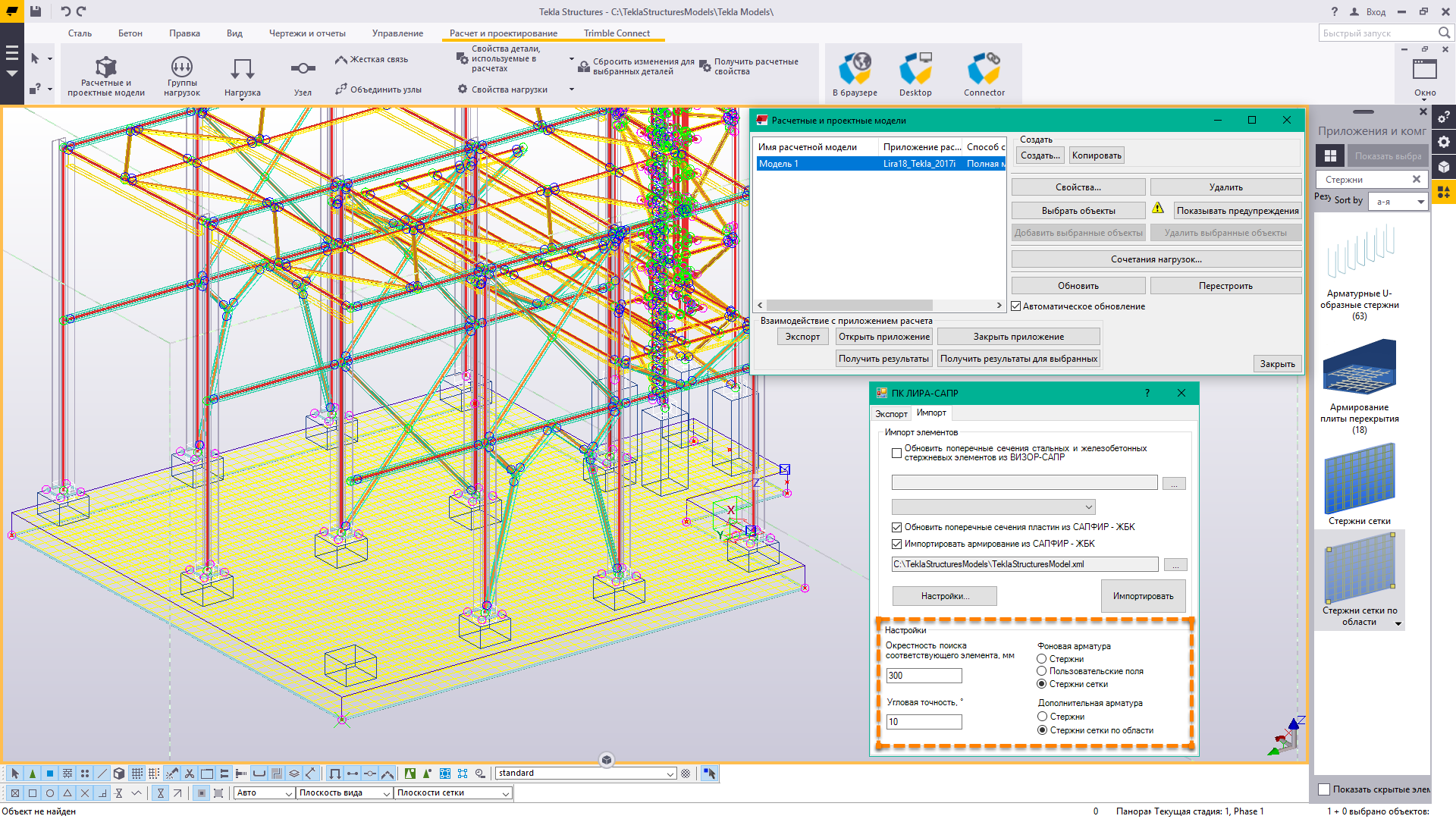 - арматура, подобранная в ПК ЛИРА-САПР и законструированная в САПФИР-ЖБК, теперь передается в конструктивные элементы Tekla Structures;