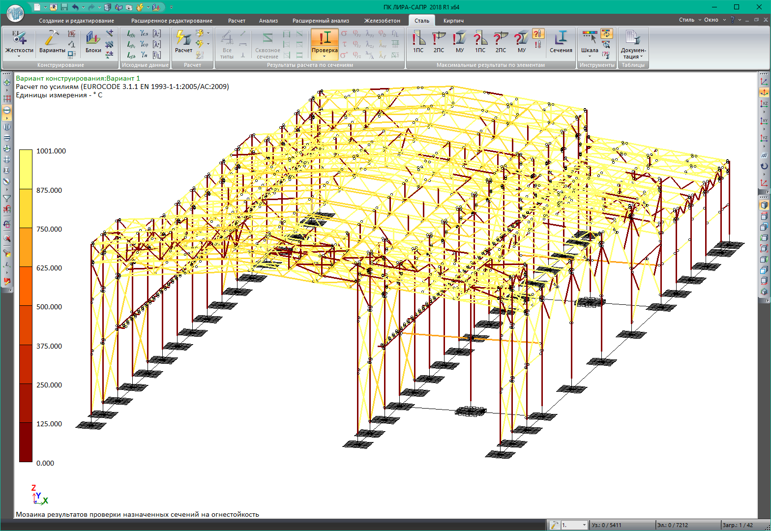 В СТК-САПР реализованы функции определения и визуализации критической температуры элементов конструкции (температуры, при которой происходит образование пластичного шарнира). Таким образом, дается возможность определения несущей способности конструкции с учетом изменения свойств металла при высоких температурах.