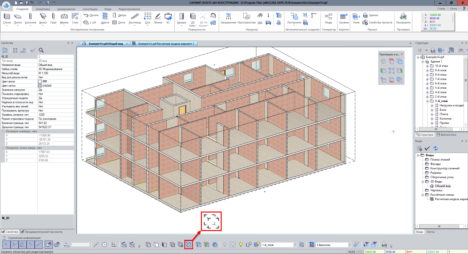 Добавлена возможность ограничения видимого объёма (куб видимости). Часть модели за его пределами визуально отсекается шестью плоскостями и делается невидимой. Можно автоматически устанавливать видимый объём по габаритам активного этажа (с Ctrl) или по габаритам выделенных объектов (с Shift). Грани в сечениях конструктивных элементов отображаются штриховками, соответствующими назначенным им материалам.