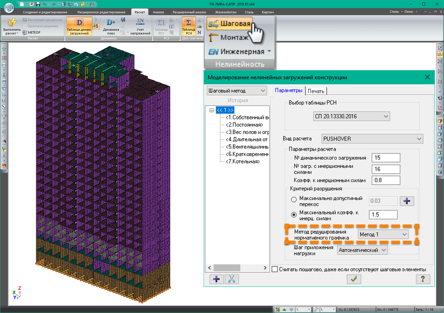 Реализован Универсальный Pushover analysis для многомассовой расчетной модели. Pushover analysis (метод спектра несущей способности) — это статический нелинейный расчет, при котором вертикально нагруженная расчетная модель сооружения подвергается монотонному наращиванию горизонтальной сейсмической нагрузки с контролем горизонтального перемещения. В качестве сейсмической нагрузки для нелинейного расчета выбираются инерционные силы, вычисленные в линейном расчете и соответствующие форме собственных колебаний с наибольшей модальной массой.