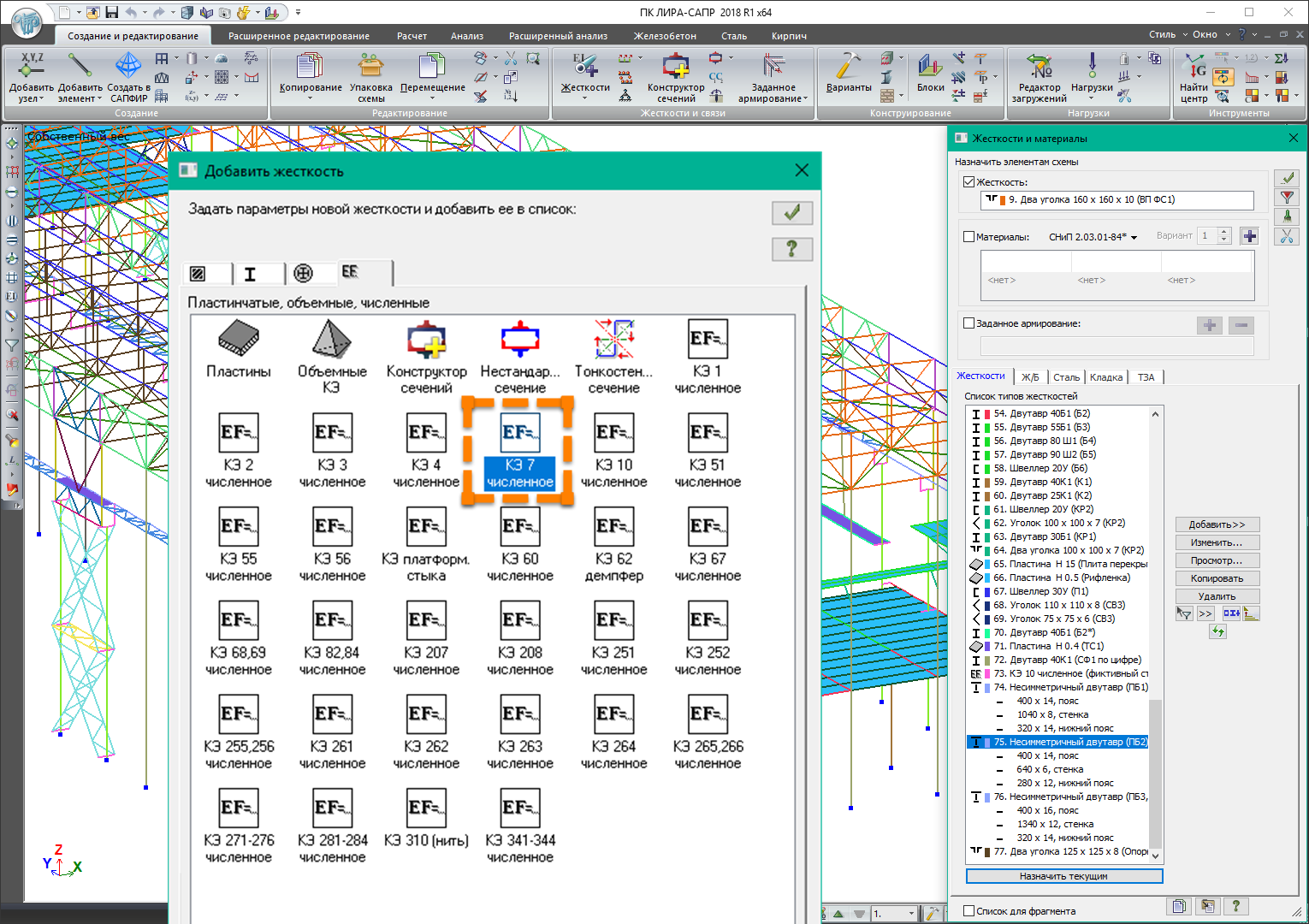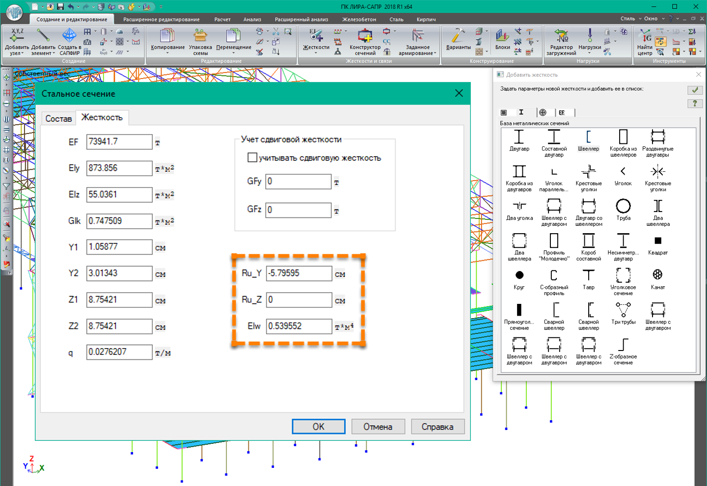 - Новый КЭ 7 (тонкостенный стержень). Жесткость для него можно задать через новое численное описание жесткости «КЭ 7 численное». В описании этой жесткости появилась новая характеристика — секториальный момент инерции (EIw). При назначении жесткости из стального сортамента автоматически вычисляется секториальный момент инерции (EIw), а также смещение центра кручения (RuY и RuZ).