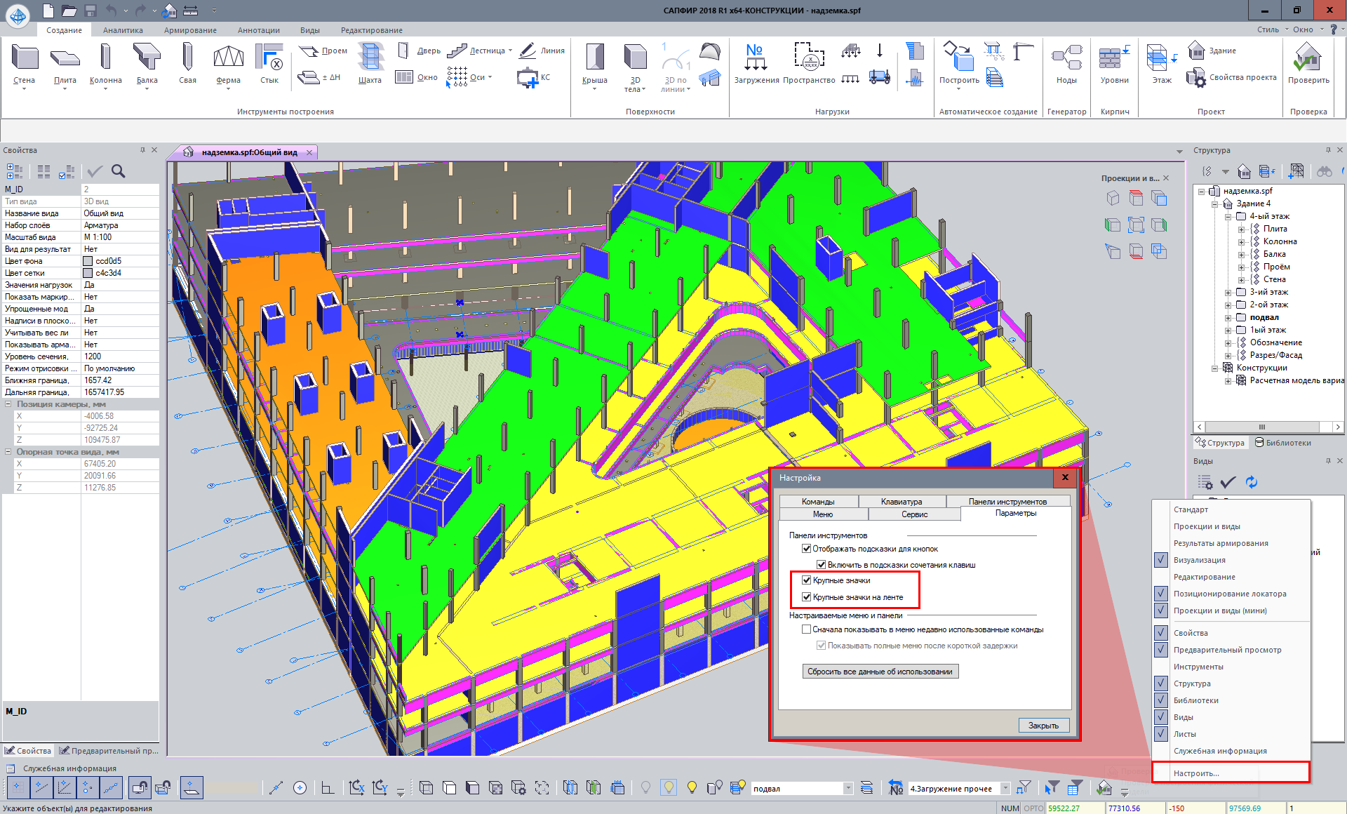 Программа САПФИР адаптирована для работы с мониторами высокого разрешения UHD или 4K. Адаптированы все диалоговые окна, создан новый, более крупный комплект иконок для всех вкладок, а также увеличены иконки в панелях инструментов. Адаптация интерфейса предполагает использование как с 4К мониторами, так и с обычными FullHD.
