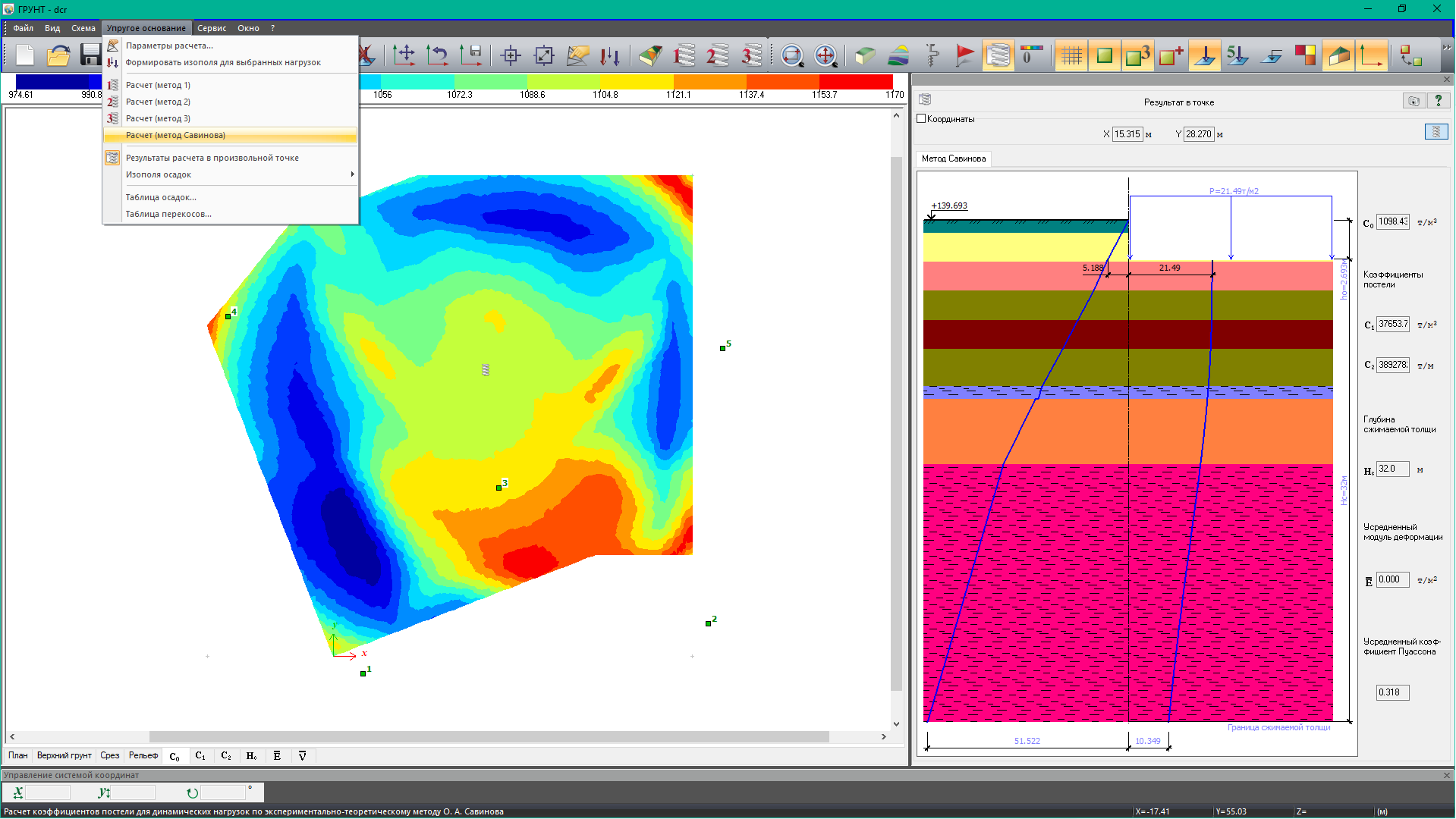 Одним из основных видов техногенных воздействий на геологическую среду являются вибродинамические нагрузки, возникающие при строительстве и эксплуатации инженерных сооружений. Такие нагрузки могут приводить к изменению физико-механических свойств грунтов оснований и тем самым влиять на напряженно-деформированное состояние зданий и сооружений. Увеличение деформируемости грунтов при динамических воздействиях по сравнению со статическими отмечается многими исследователями. В новой версии реализован альтернативный расчет определения коэффициента постели C1 при динамических воздействиях на фундамент по формуле Савинова.
