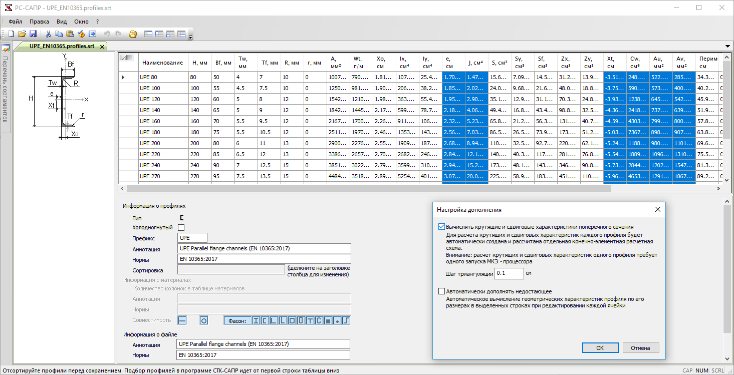 - Недостающие геометрические характеристики в верифицируемом сортаменте дополняются вычисленными.