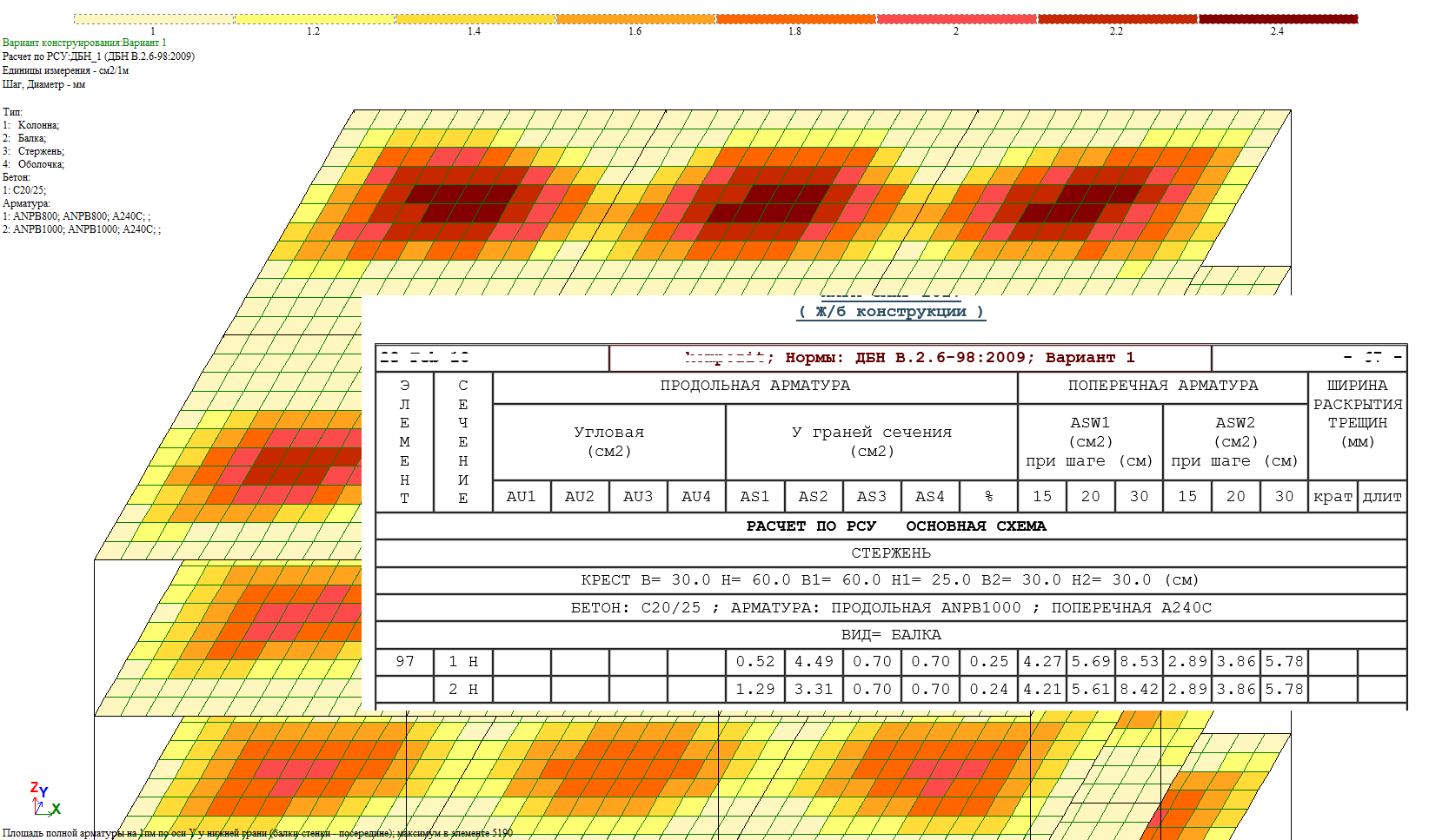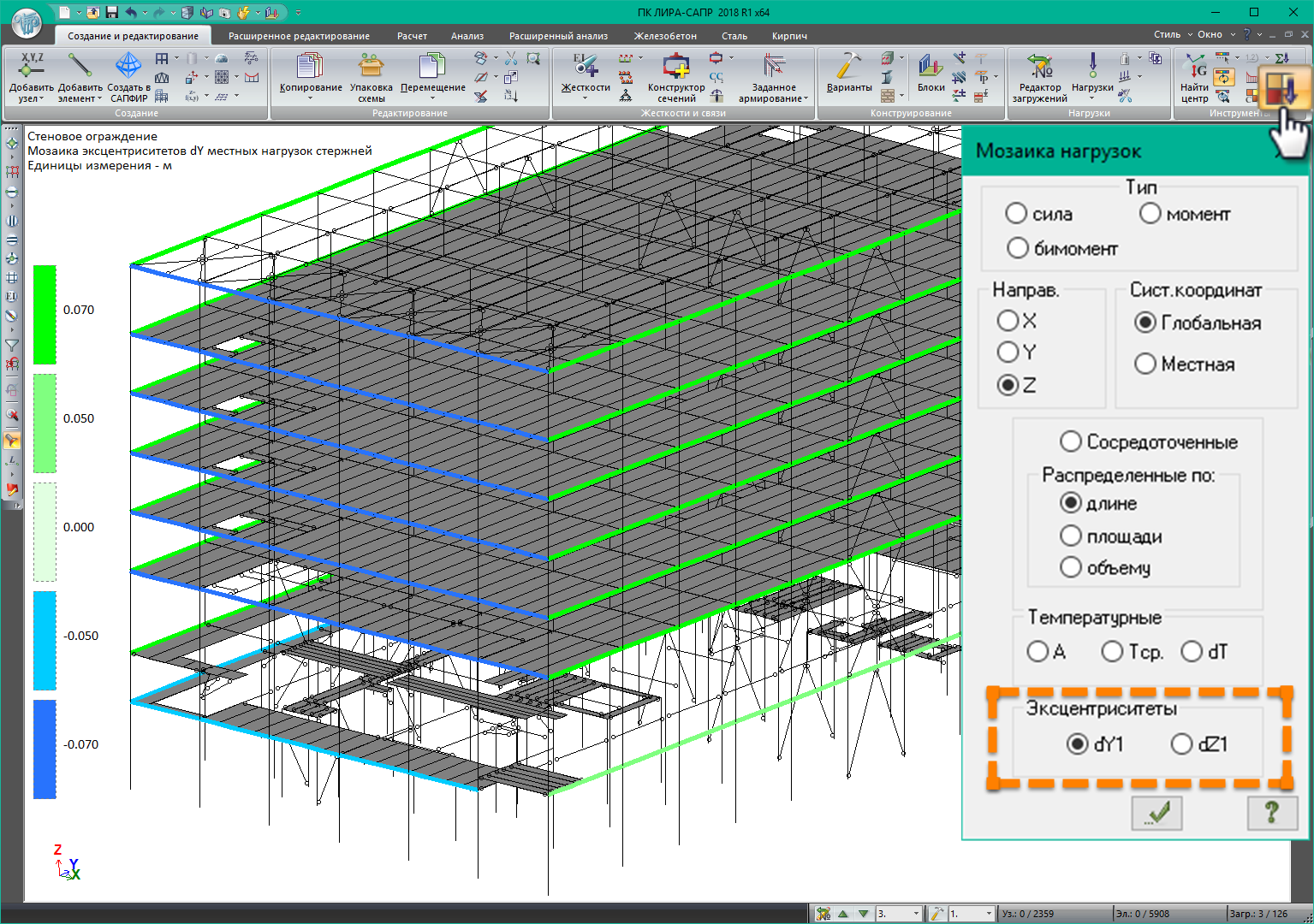 Для контроля нагрузок, заданных с эксцентриситетом, добавлена мозаика величин эксцентриситетов на стержни.