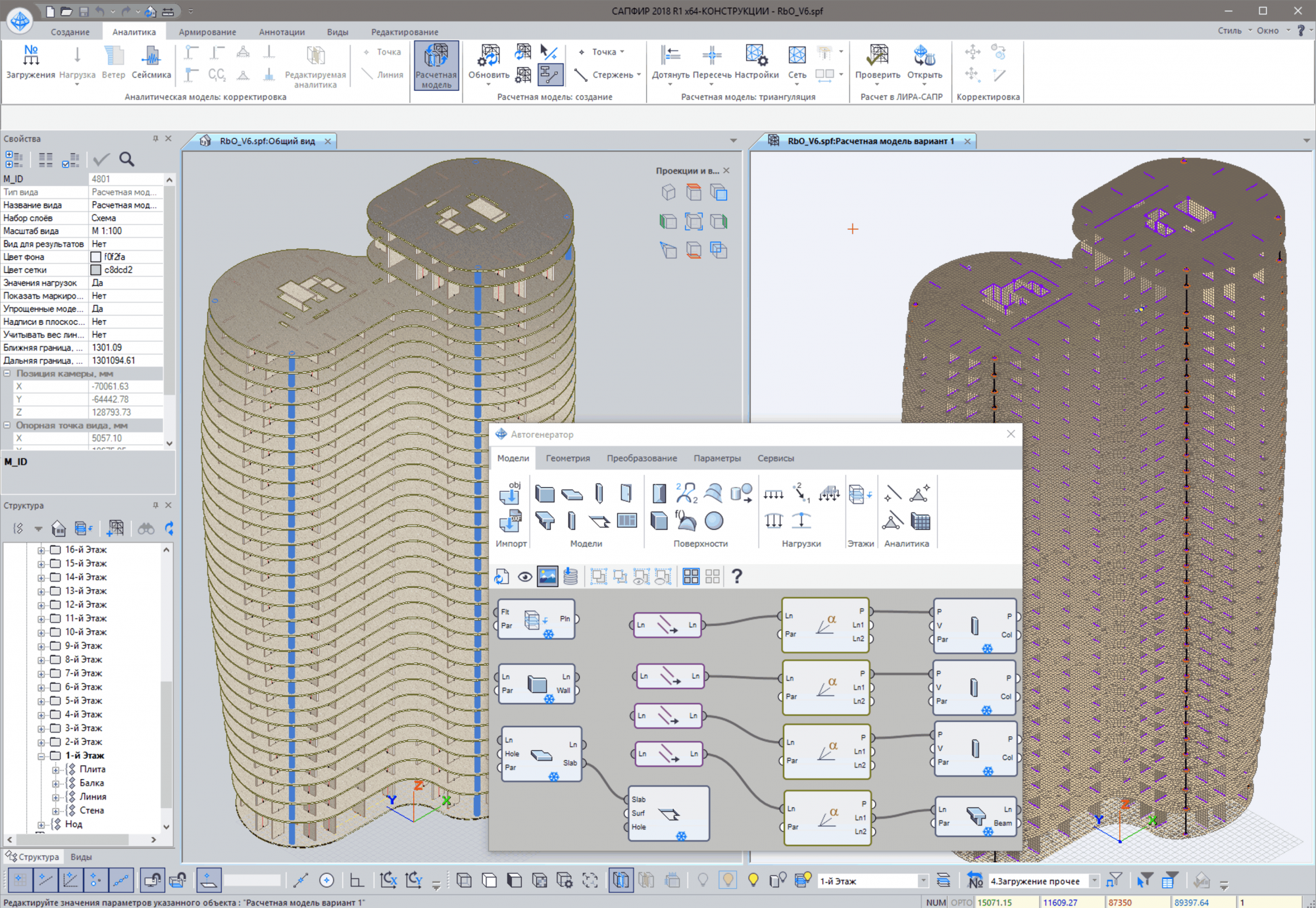 САПФИР-Генератор - новое поколение интерфейса пользователя. Эта разработка демонстрирует тренд - текстовый редактор, графический редактор, визуальное программирование. Система визуального программирования позволяет выполнять параметрическое моделирование зданий и сооружений произвольной формы. Данная система представляет собой графический редактор алгоритмов (последовательности действий), который использует инструменты моделирования САПФИР-3D. На основании такой 3D модели генерируется расчетная схема для последующего расчета в ЛИРА-САПР.