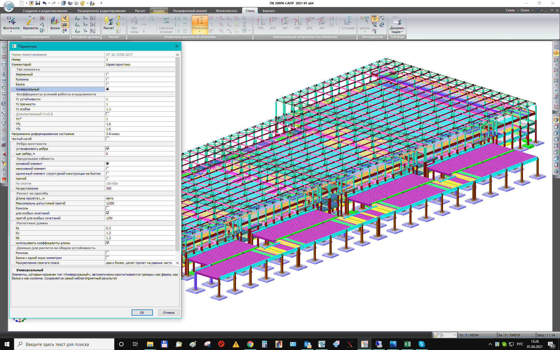 • Добавлен новый тип расчетного элемента - “универсальный” стержень (ферма-балка-колонна), который позволяет получить огибающий результат по всем проверкам стального сечения. Расчет и/или проверка универсального элемента выполняется последовательно по трем расчетным процедурам – как для ферменного элемента, колонны и балки. При формировании таблиц и мозаик результатов для универсального элемента выводятся максимальные проценты использования сечения по соответствующим проверкам. В локальном режиме расчета элемента схемы доступна расширенная информация о результатах расчета – при анализе универсального элемента можно выбрать расчетную процедуру (ферменный элемент, колонна или балка) и уточнить процент использования, представляющий интерес.