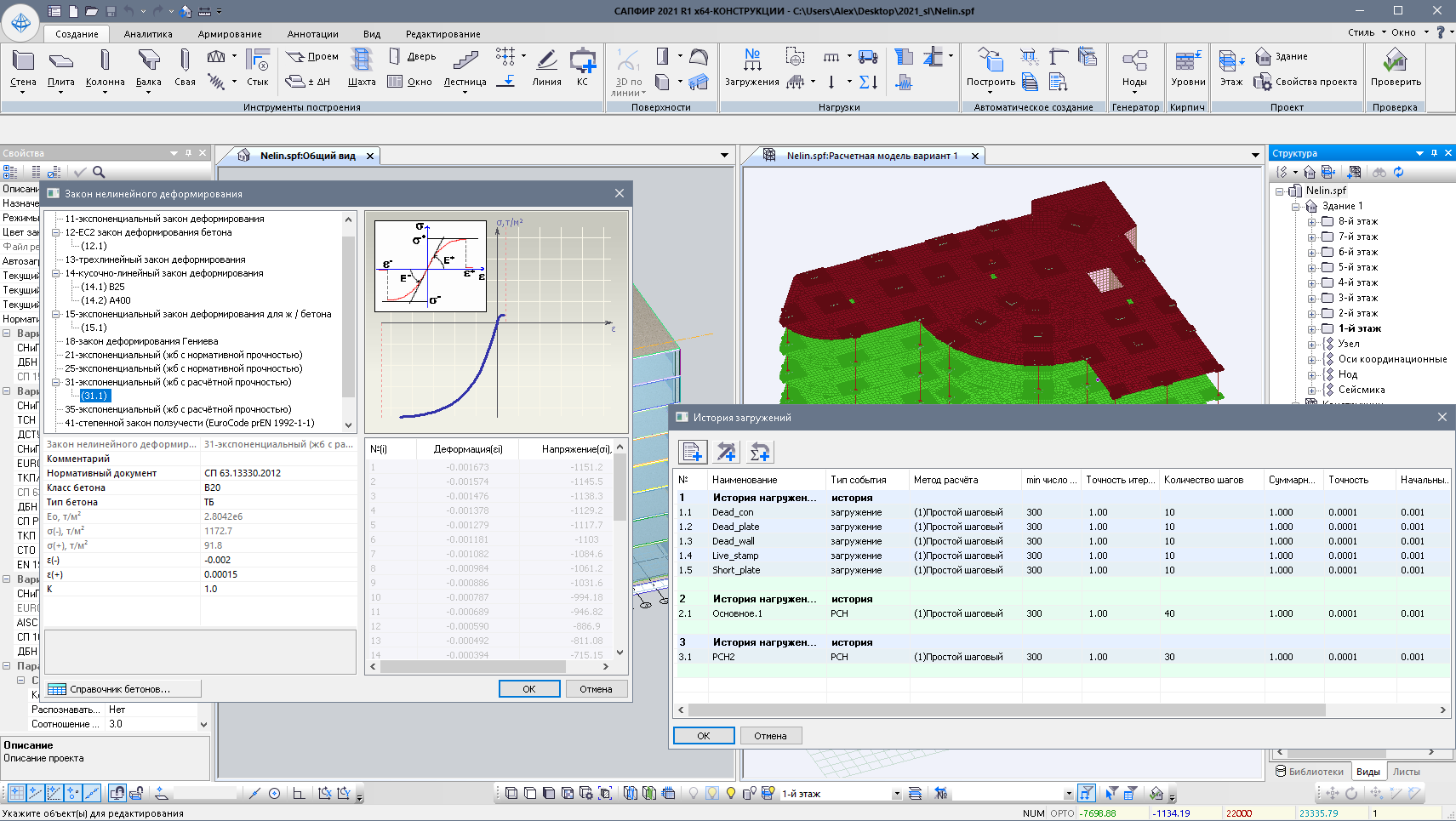 • Реализована возможность использовать геометрически нелинейные конечные элементы в расчет “Инженерной нелинейности 2”. Область применения – уточненный расчет мачт (расчет на ветровую пульсацию «по нормам» с учетом преднапряжения; более точные собственные частоты для проверки на резонанс), вантовых мостов (в том числе точнее частоты для проверки на флаттер), большепролетных покрытий (на резонанс от шума) и т.п.