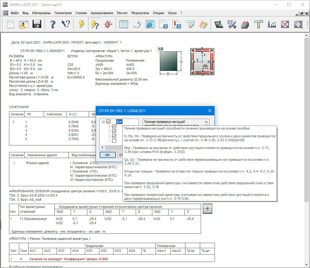 Результаты проверки на заданное армирование для норм СП РК EN 1992-1-1:2004/2011