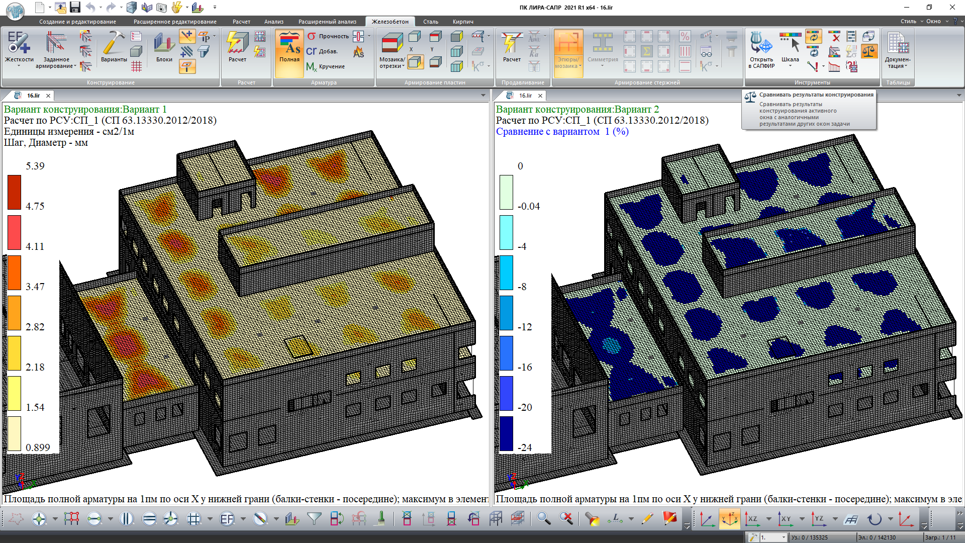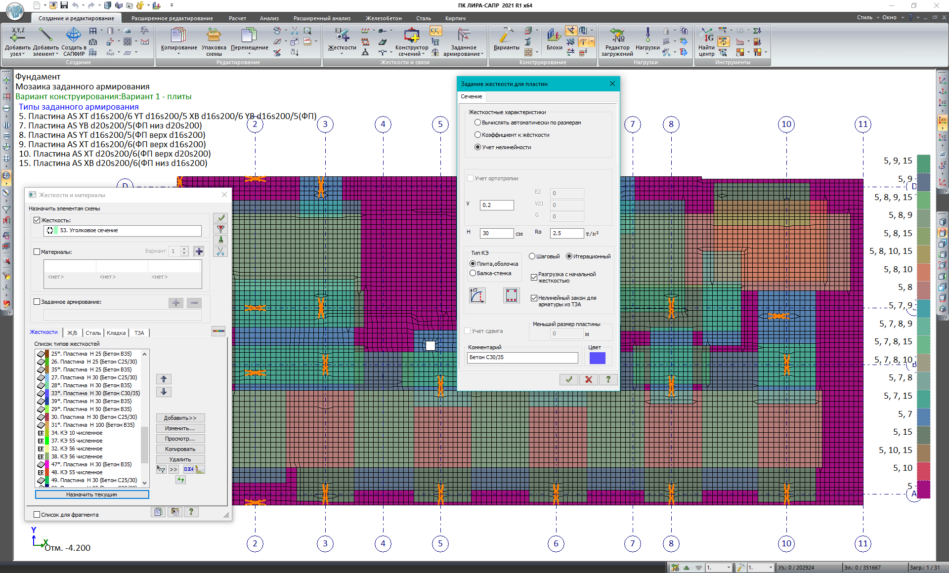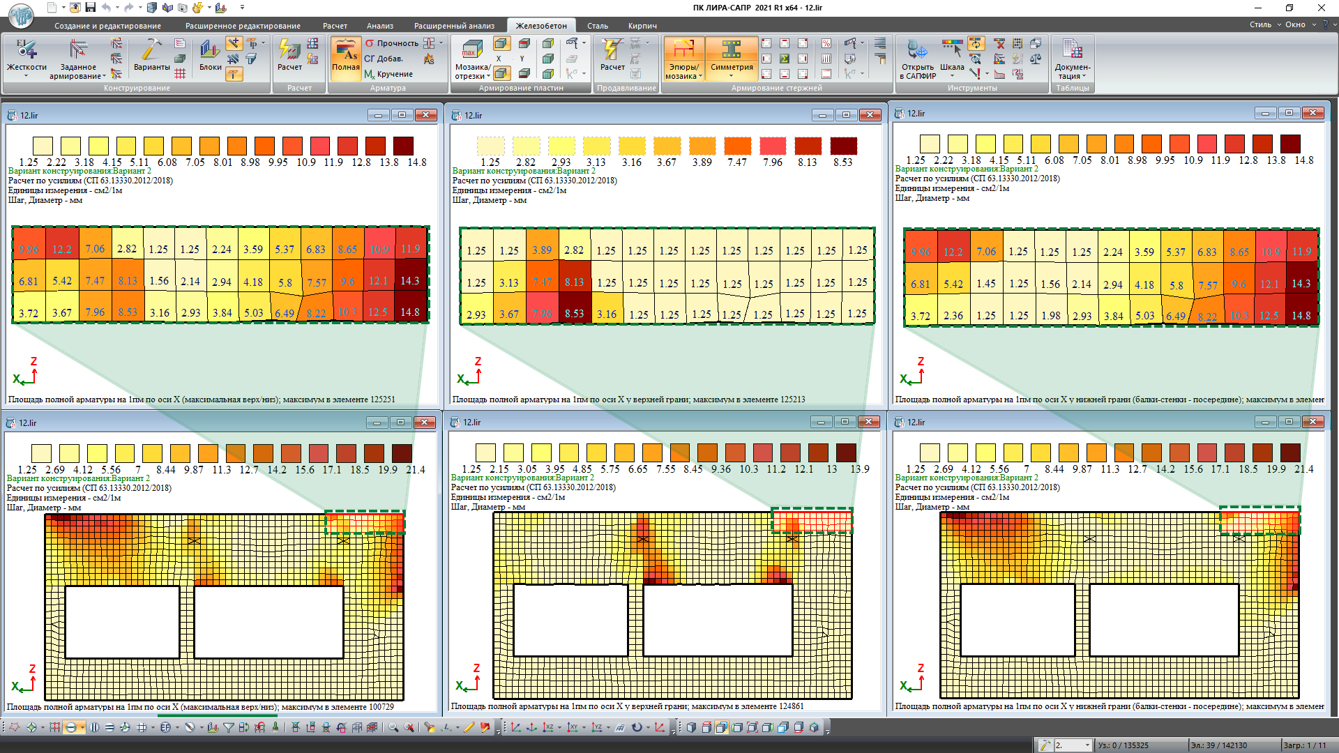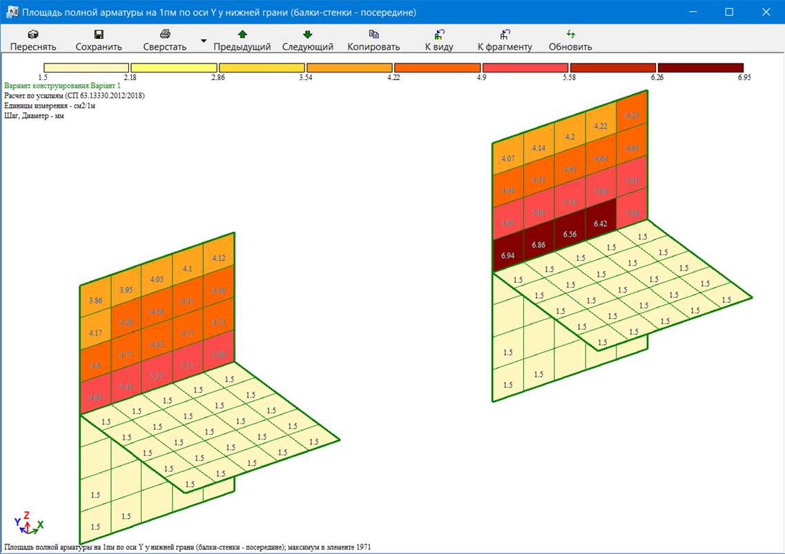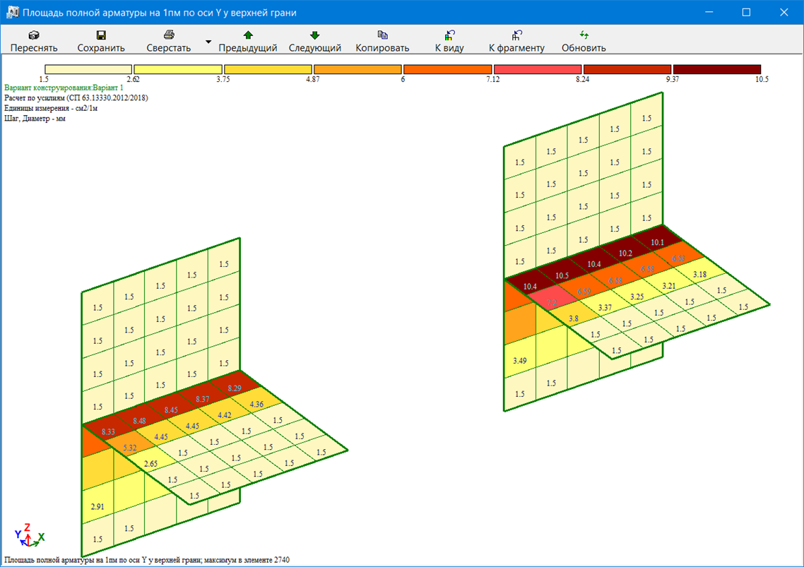 • Реализована возможность подбора/проверки армирования в пластинчатых элементах, для которых вычислены напряжения не только в центре тяжести, но и в узлах. Необходимо отметить, что при сгущении сети КЭ разница результатов уменьшается.