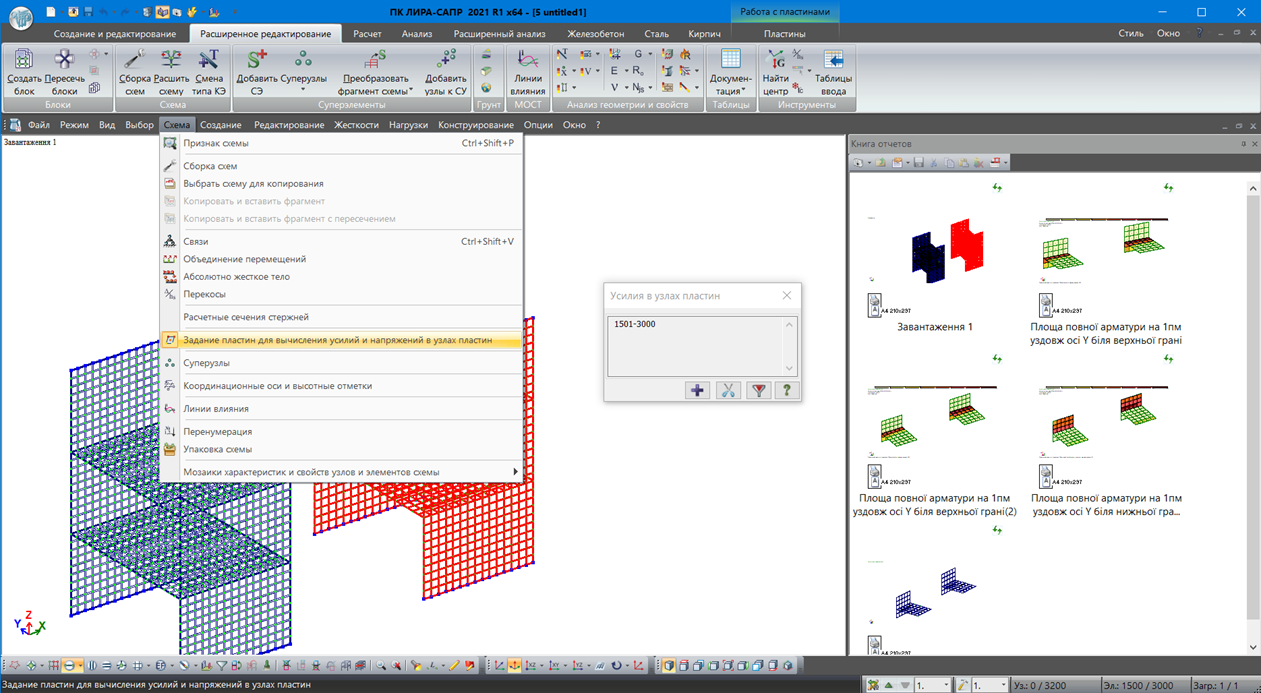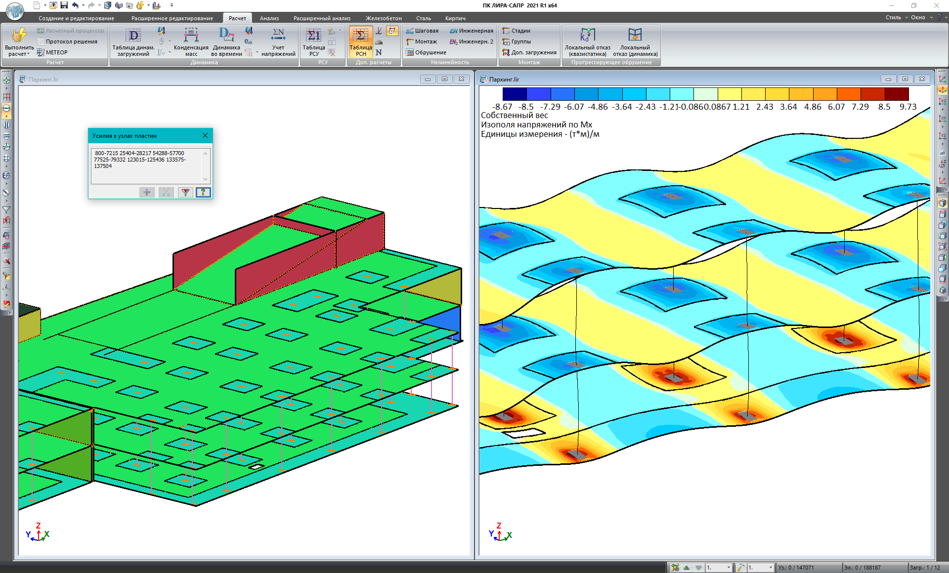 • Таблицы результатов для пластинчатых элементов расширены информацией о напряжениях в узлах с учетом нумерации их в расчетной схеме. РСН и РСН определяющие (расчетные / расчетные длительнодействующие / нормативные / нормативные длительнодействующие), усилия от РСН, таблицы РСУ (расчетные / расчетные длительнодействующие / нормативные / нормативные длительнодействующие), главные и эквивалентные напряжения (по усилиям / РСН / РСУ).