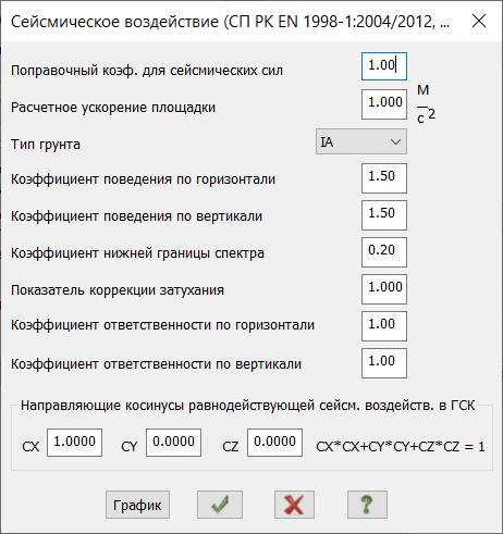 - Для модулей динамики "Расчет на сейсмическое воздействие по нормам СП РК 2.03-30-2017 (Казахстан) и СН КР 20-02:2018, (Кыргызстан) (60)", значение по умолчанию для коэффициентов ответственности по горизонтали и по вертикали приняты равным 1.0
