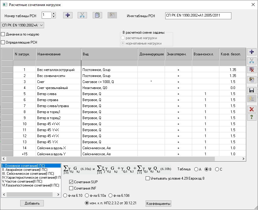 - Добавлена возможность создавать комбинации нагрузок в соответствии с изменениями в п.2.2.3.2 НП к СП РК EN 1990:2002+A1:2005/2011