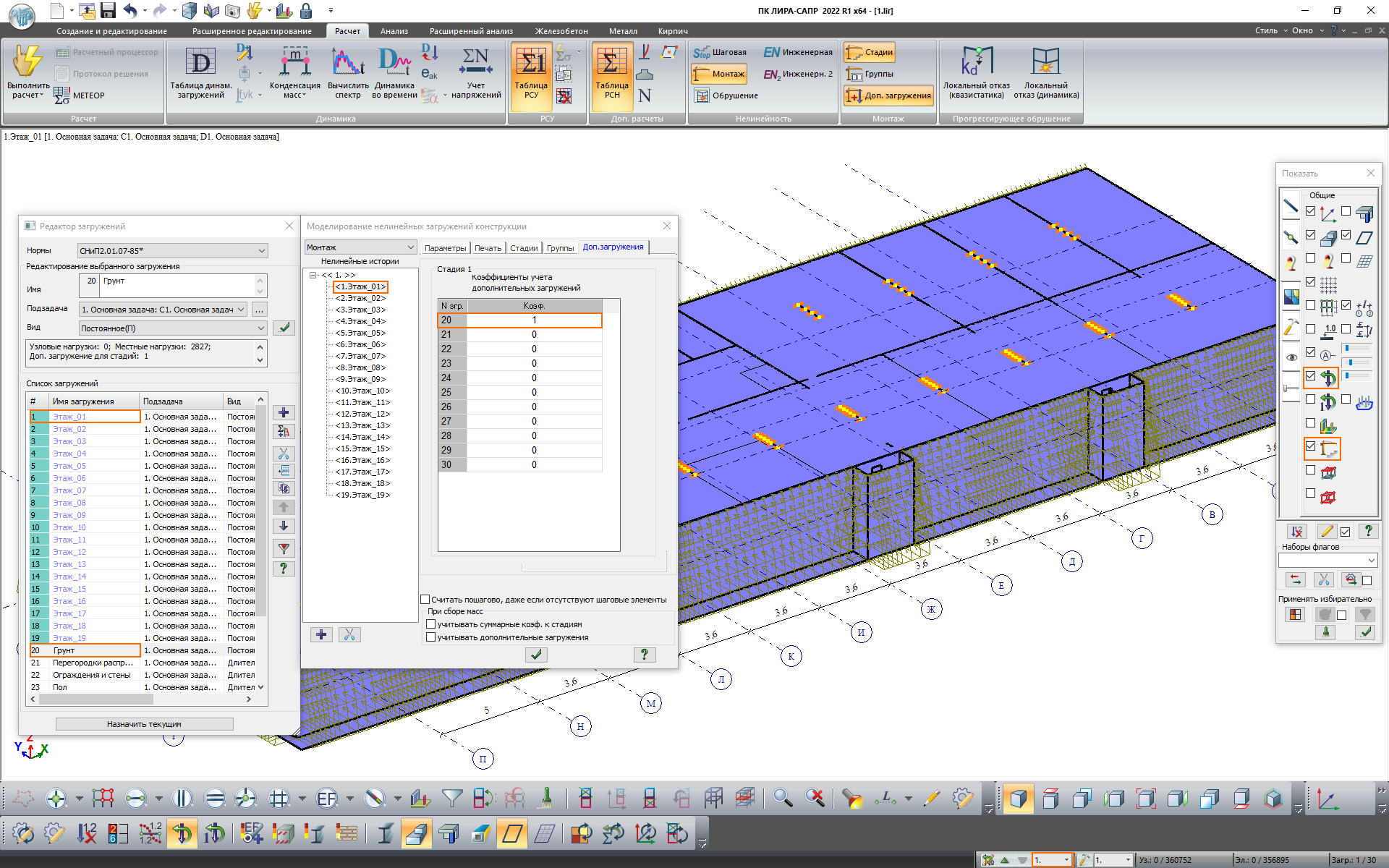 Для задач с моделированием возведения добавлены контроли задания исходных данных, также в диалоге Моделирование нелинейных загружений добавлена команда для отметки элементов, которые смонтированны на текущей стадии, с нагрузками, приложенными ранее монтажа.