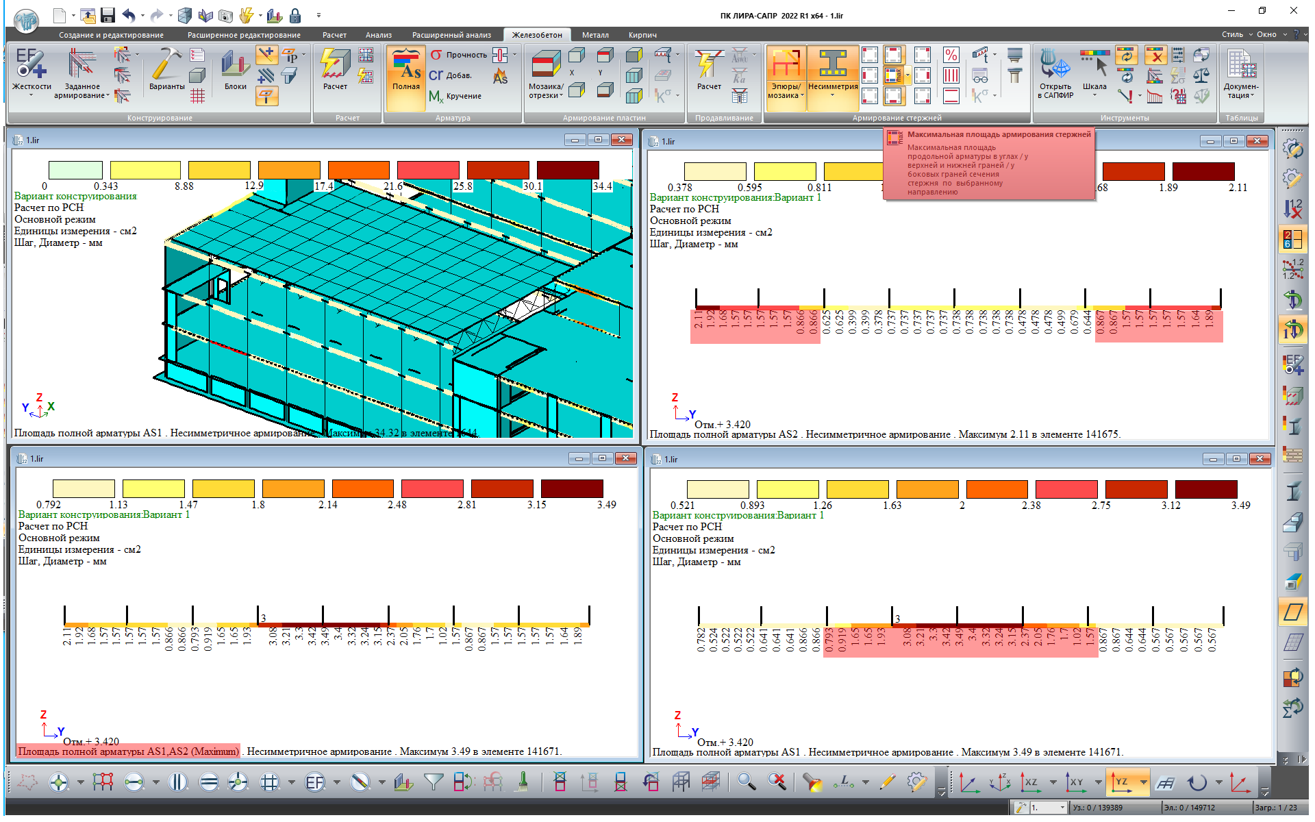 Добавлена возможность вывода мозаики максимальной площади продольной арматуры в углах/у верхней и нижней гранях/у боковых гранях сечения стержня по выбранному направлению.