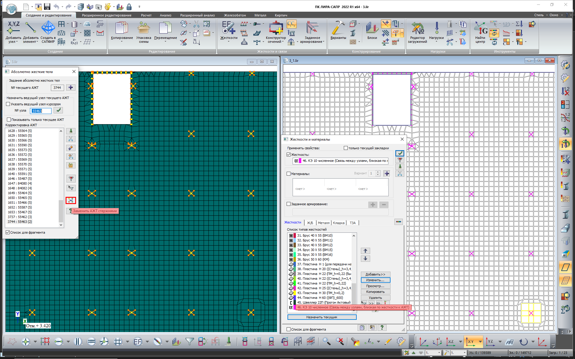 В диалог формирования АЖТ добавлена возможность преобразования выбранных АЖТ в виде стержней большой жесткости. Данная возможность может быть использована при моделировании температурных нагрузок, например, для плит перекрытий чтобы исключить концентрации напряжений в местах стыковки с элементами колонн.