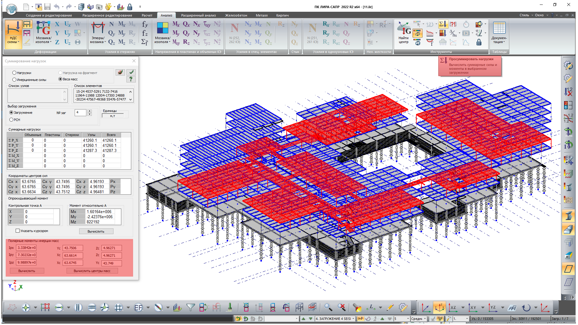 В диалоге “Суммирование нагрузок” добавлена возможность вычисления полярных моментов инерции масс как для всей схемы, так и для произвольного фрагмента схемы относительно вычисленных центров масс или произвольно заданных полюсов.