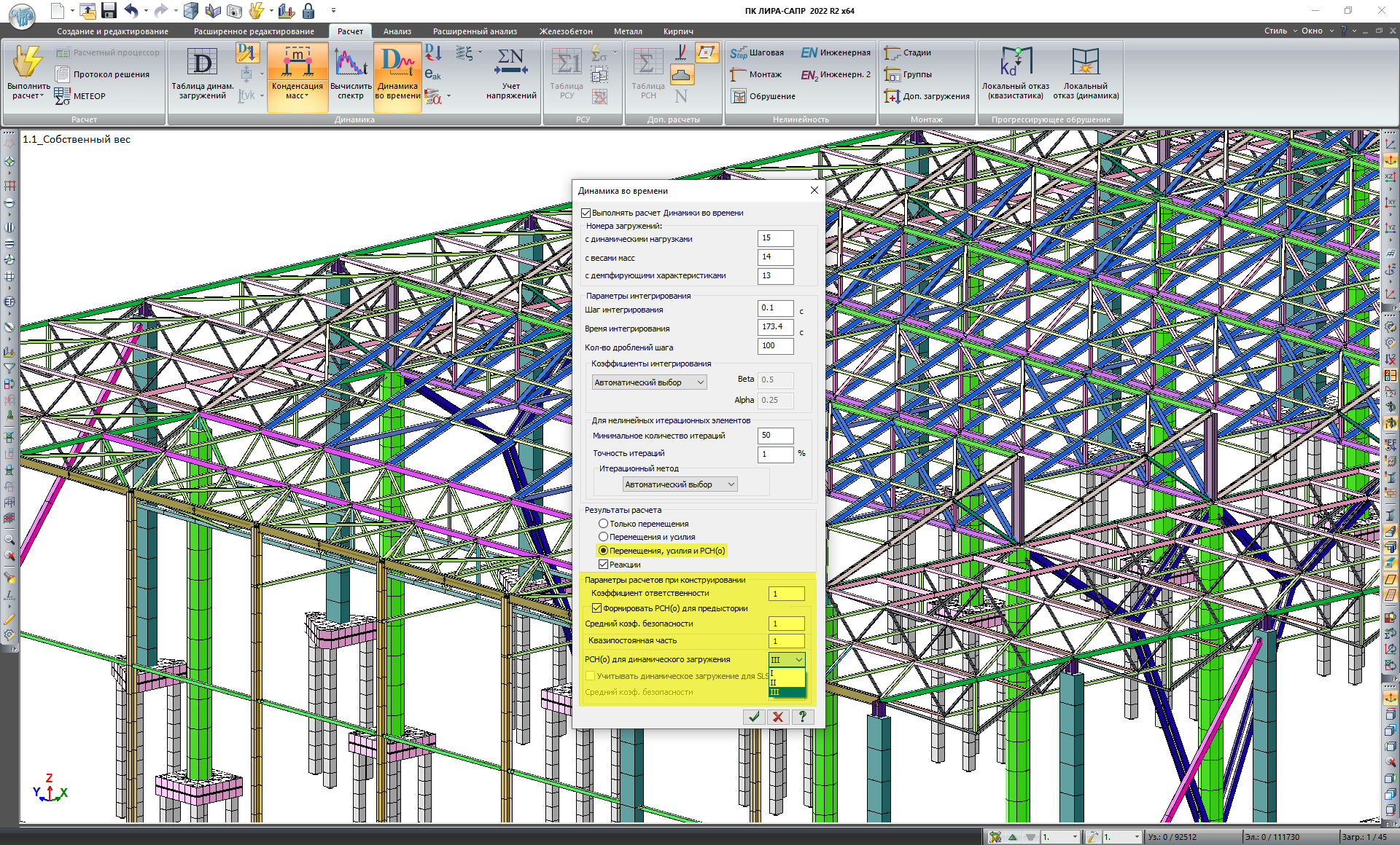 - Для норм EN 1990:2002+A1:2005, СП РК EN 1990:2002+A1/2011 реализована возможность формировать определяющие усилия РСН(о) по результатам расчета задач динамики во времени. Данная возможность позволяет, например, использовать расчеты во временной области для проектирования активной сейсмоизоляции и одновременно выполнять проверку несущей способности конструктивных элементов (железобетонных, стальных).