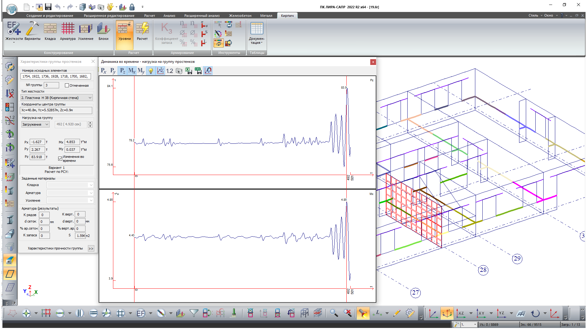 Реализовано построение графиков изменения нагрузок для кирпичных уровней в задачах динамики во времени.