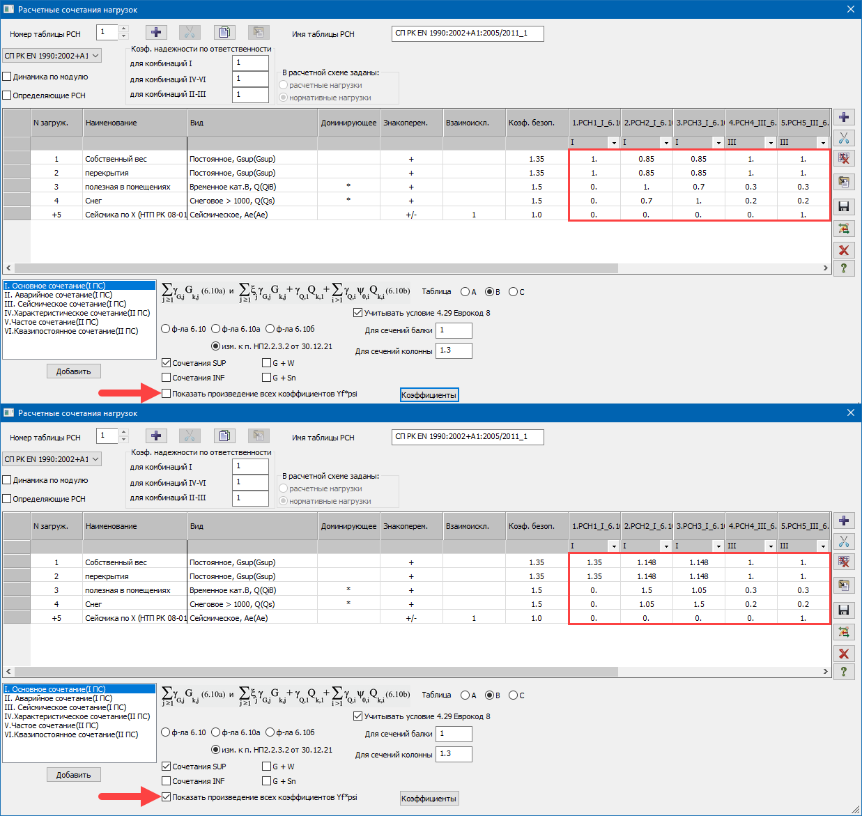 Для норм СП РК EN 1990:2002+А1:2005/2011 реализована опция представления таблицы сочетаний “в явном виде”, где коэффициенты сочетаний и редукции скорректированы с учетом коэффициентов безопасности к нагрузкам и вида заданных нагрузок.