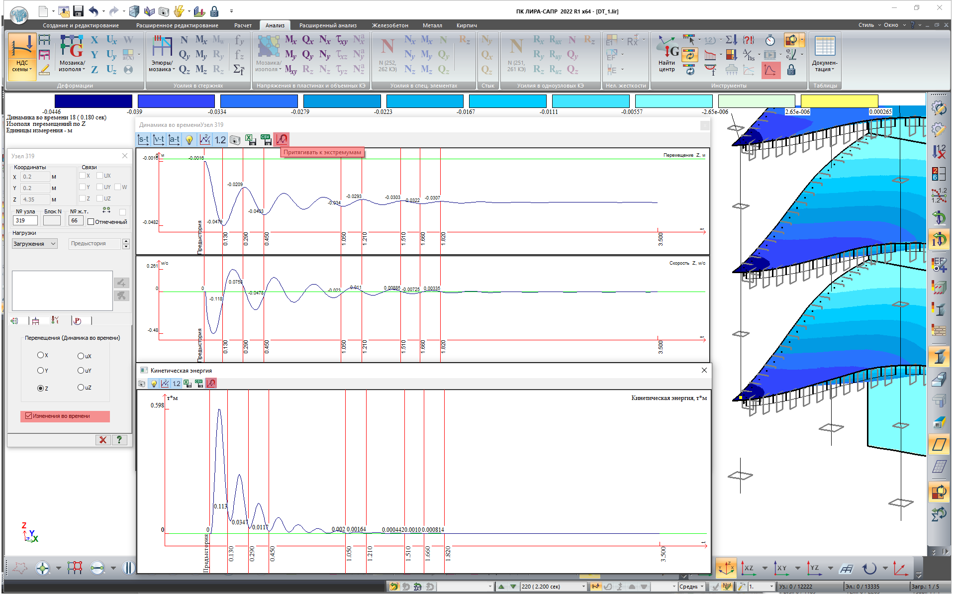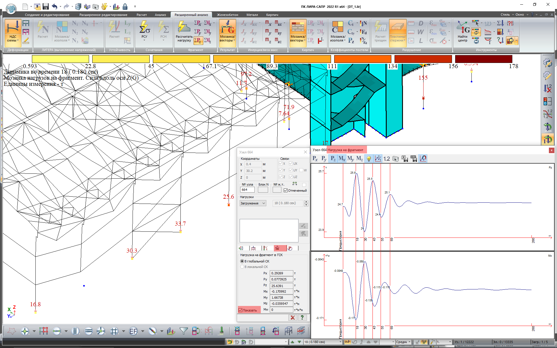 Для узлов в которых вычислена нагрузка (реакции) на фрагмент в динамике во времени реализовано построение графиков изменения реакций во времени.