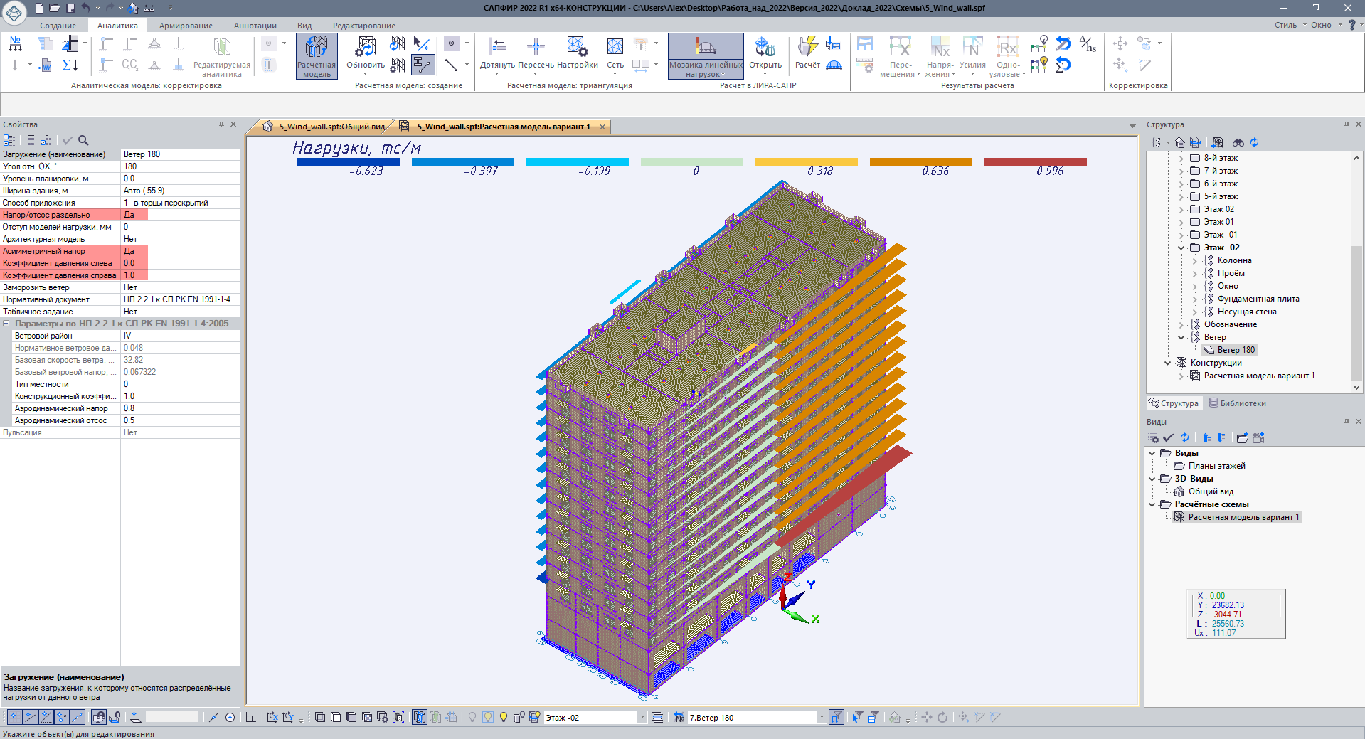 - Реализация положения СП РК EN 1991-1-4:2005/2011 Ветровые воздействия п.7.1.2 (Ассиметричный напор ветра). Для способов приложения ветровой нагрузки 1-в торцы перекрытий и 2-напор/отсос в пространстве, добавлена возможность задания параметра Ассиметричный напор, с указанием коэффициентов давления слева и справа (для всех нормативов).