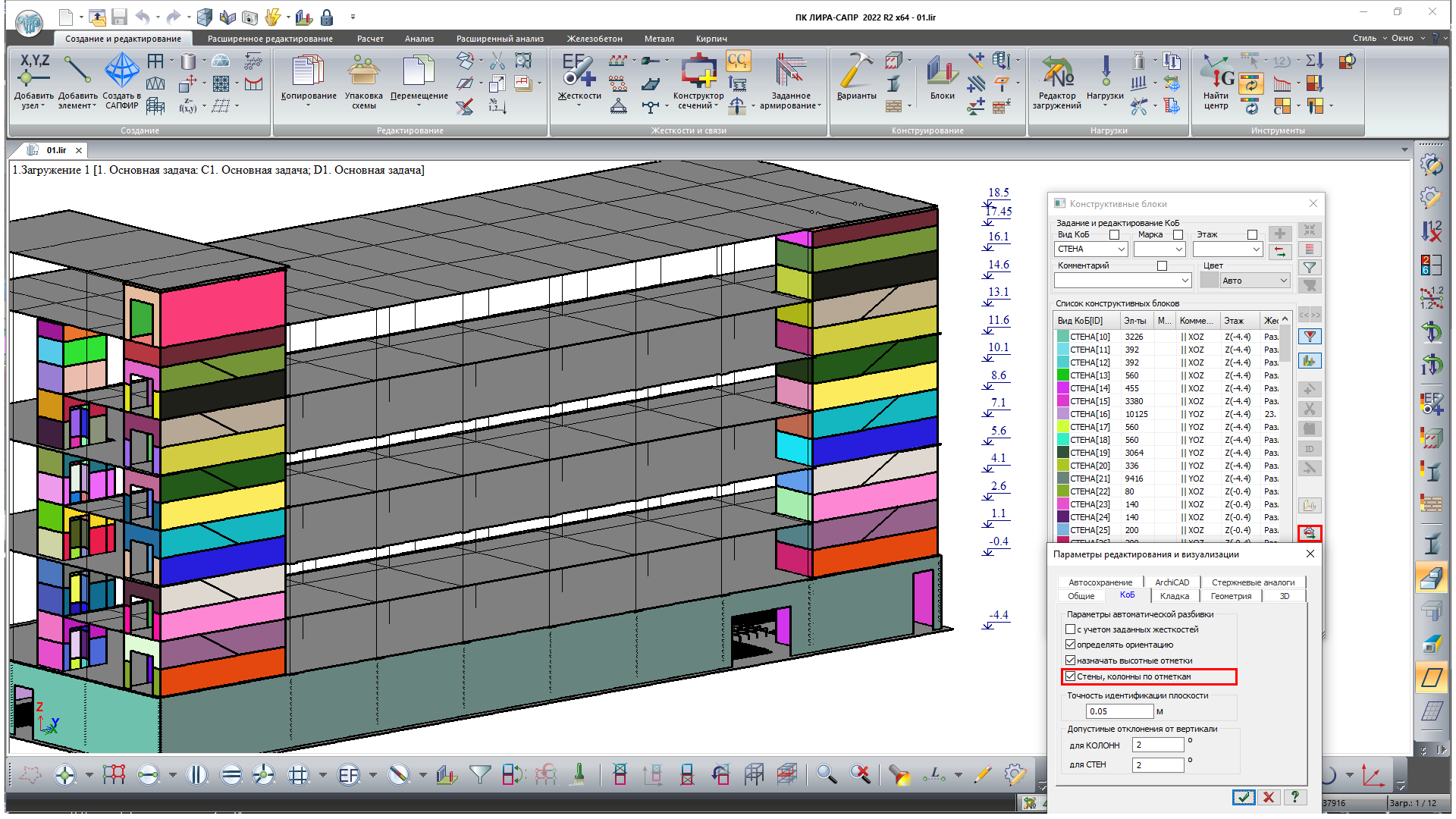 Добавлена возможность автоматической разбивки по вертикали конструктивных блоков стен и колонн с учетом установленных высотных отметок.