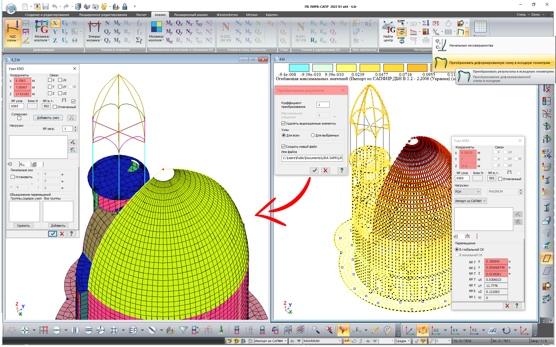 Для учета несовершенств в сложных конструкциях используют подход, когда формируют начальную геометрию с искривлением. Более правильный выбор формы начальных несовершенств должен повторять глобальную форму потери устойчивости. В текущей версии реализована технология создания новой геометрии схемы на базе результатов (перемещений, форм колебаний, форм потери устойчивости).
