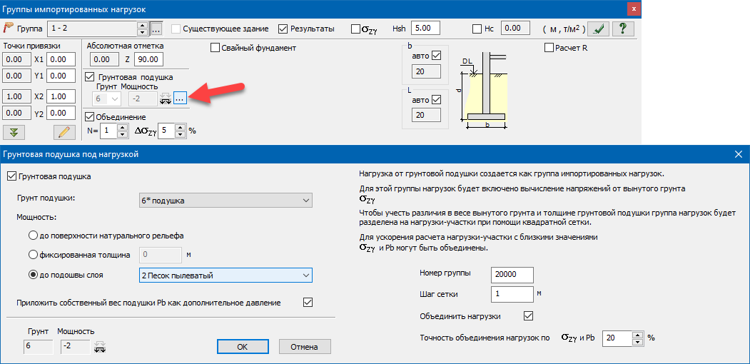 - сделана новая опция добавления веса подушки в дополнительные нагрузки (в таком случае бытовое давление считается от грунтов природного залегания).