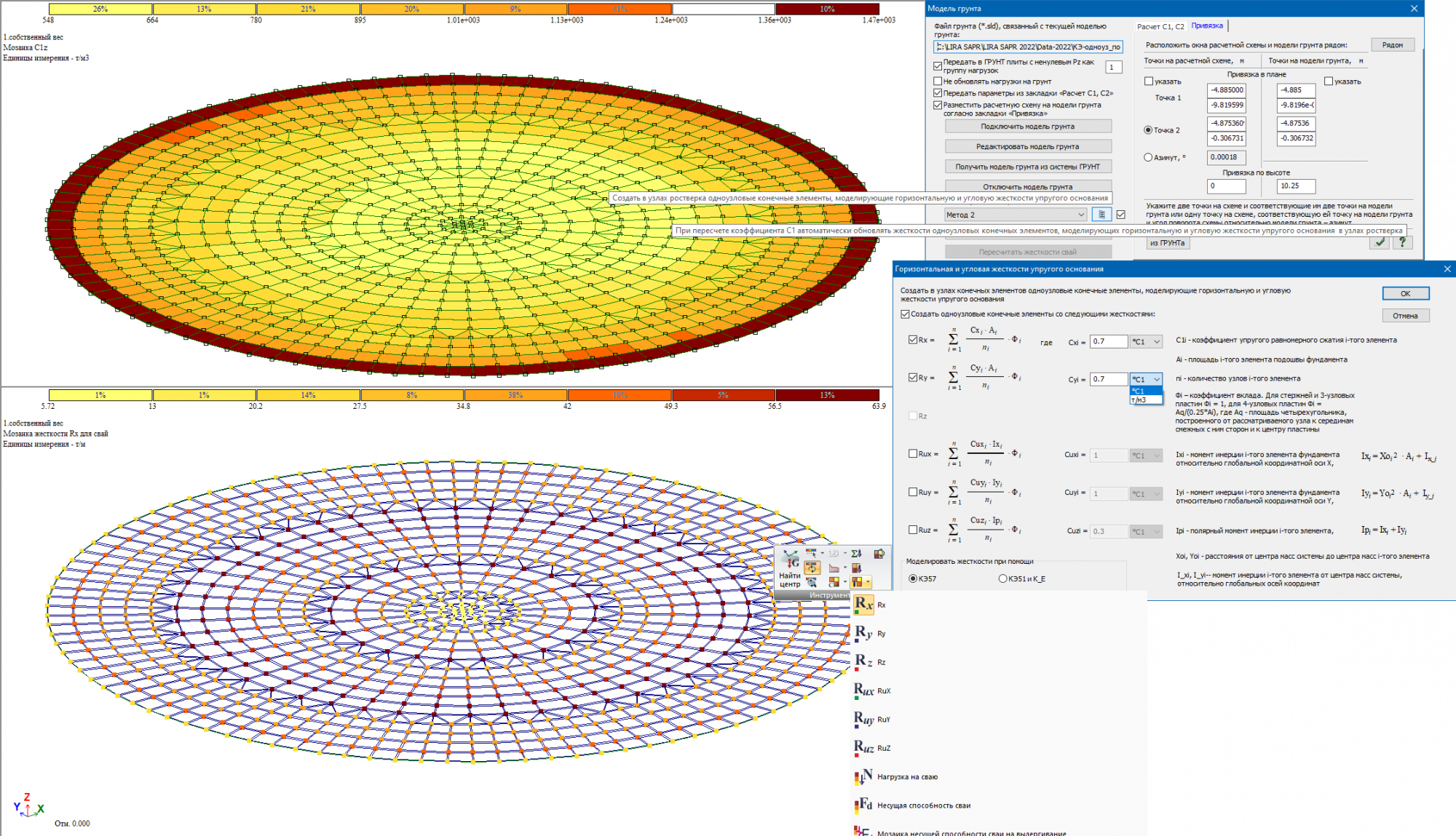 Реализован расчет жесткостей одноузловых КЭ для моделирования горизонтальной жесткости закрепления фундамента в зависимости от С1z, назначенных на примыкающие элементы, или от С1z, заданного пользователем.