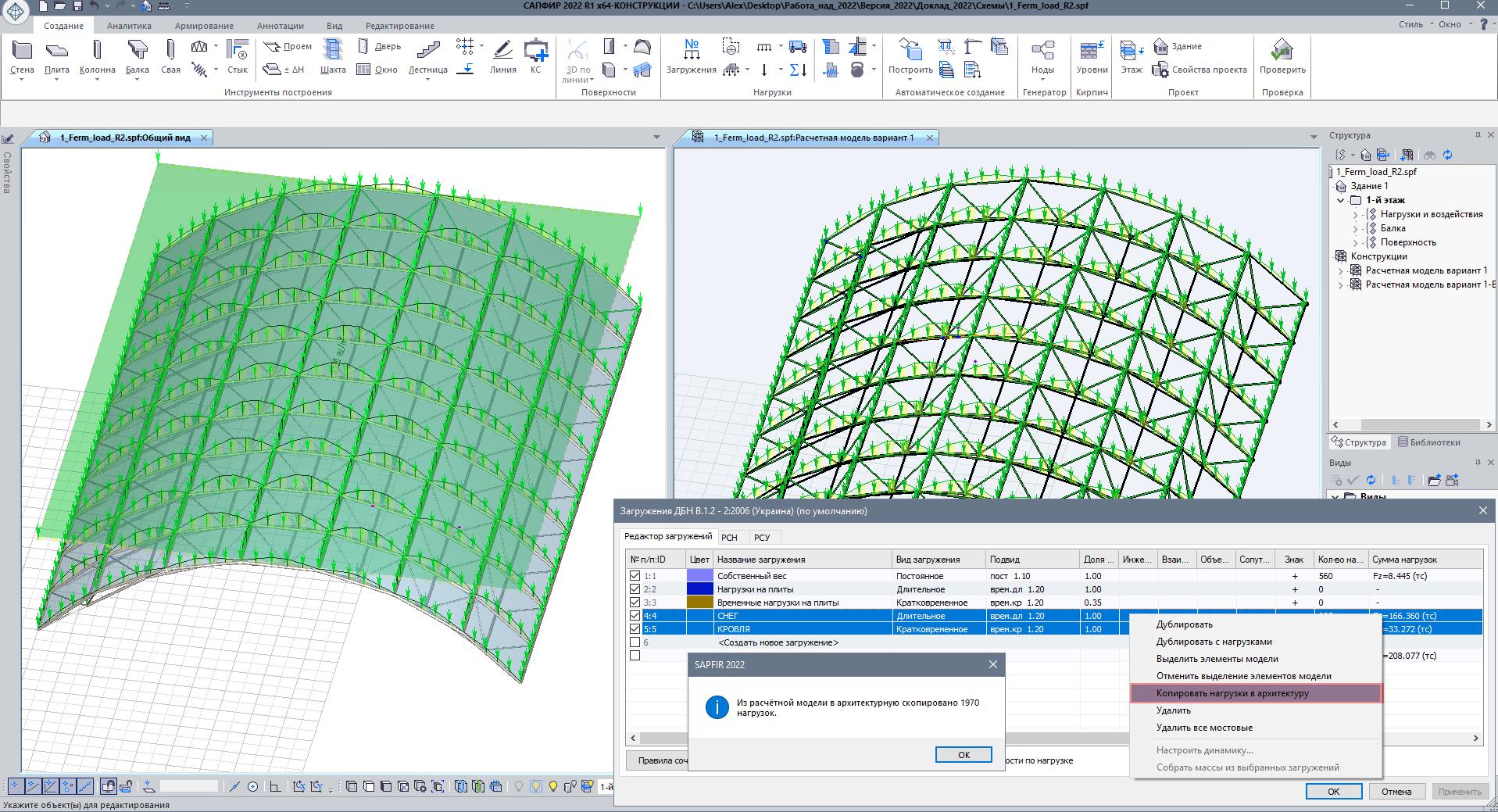 - В режиме “Расчетная модель” в диалоге “Редактор загружений” доступна опция Копировать нагрузки в архитектуру. Данный инструмент позволяет скопировать любые нагрузки в архитектуру, в том числе ветровые нагрузки, нагрузки, полученные инструментом сбора нагрузки через посредники.