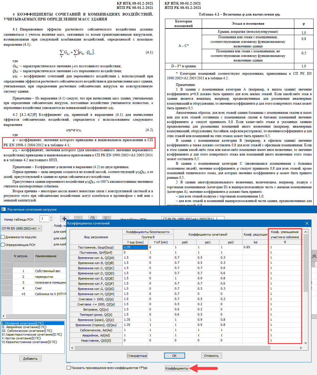 В таблице РСН для норм СП РК EN 1990:2002+А1:2005/2011 в меню “Коэффициенты” добавлен столбец коэффициентов fi, предназначенных для снижения вклада загружения в сейсмическую расчетную комбинацию. По умолчанию все значения равны 1.