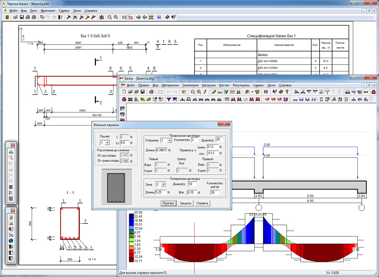 Комплекс состоит из отдельных программ - КОМПОНОВКА, БАЛКА, КОЛОННА, ФУНДАМЕНТ, ПОДПОРНАЯ СТЕНА, ПЛИТА, РАЗРЕЗ (СТЕНА), КИРПИЧ. Эти программы связаны информационно, кроме того, каждая из них может работать в автономном режиме.