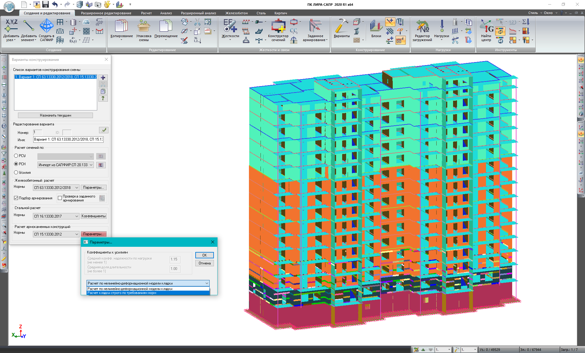 - В новой версии разработан альтернативный алгоритм расчета армокаменных конструкций в «строгом соответствии с нормами» СП 15.13330.2012 (изменение №3). Соответствующая настройка помещена в набор свойств для вариантов конструирования. Для описания расчетных параметров кладки и армирования сетками создан новый интерфейс пользователя.