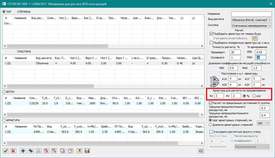 - Для норм Eurocod и им подобным реализован подбор арматуры продавливания с учетом продольной рабочей арматуры.