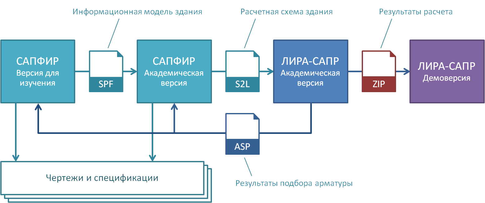 Демоверсия ПК ЛИРА-САПР включает в себя «САПФИР версия для изучения». В этой версии вне учебного класса, без ключа, можно создать полноценную расчетную схему (с заданными нагрузками, разложенными по загружениям, триангуляцией и т.п.). Файл задачи, созданный в этой версии, можно передать в систему ВИЗОР-САПР учебной версии (Academic SET), дополнить параметрическими таблицами (РСУ/динамика/сбор масс) и сделать расчет. Сохраненные исходные данные (расчетная схема в формате «lir») и результаты расчета (в том числе экспорт подобранного армирования для САПФИР-ЖБК) забираем домой, просматриваем результаты в демоверсии ЛИРА-САПР, а оформление чертежей армирования производим в САПФИР-ЖБК версии для изучения. Т.е. анализ, оформление результатов расчета и выпуск чертежей КЖ и КЖИ можно также производить дома. Архивация всех данных для переноса на другой компьютер и в демоверсию описана далее. Таким образом, время необходимого пребывания в компьютерном классе ВУЗа сводится к минимуму.