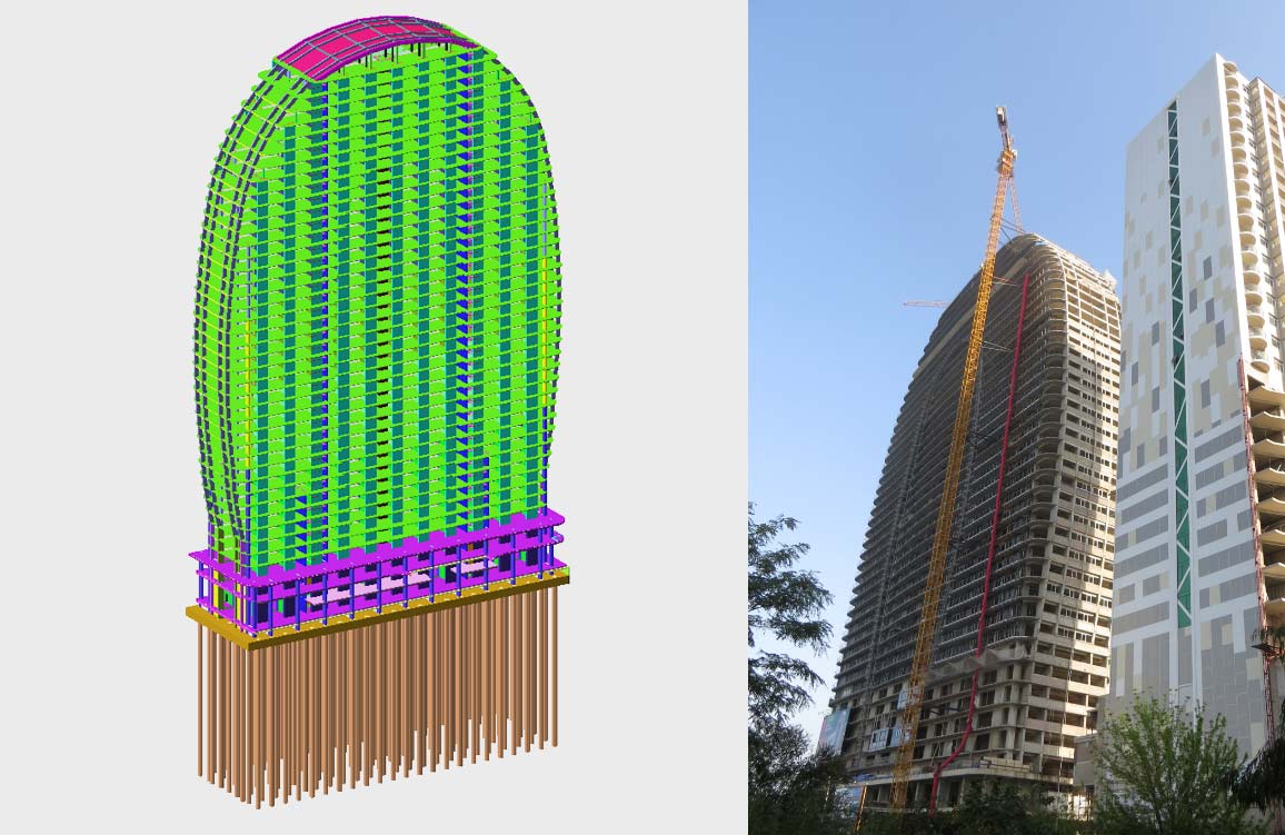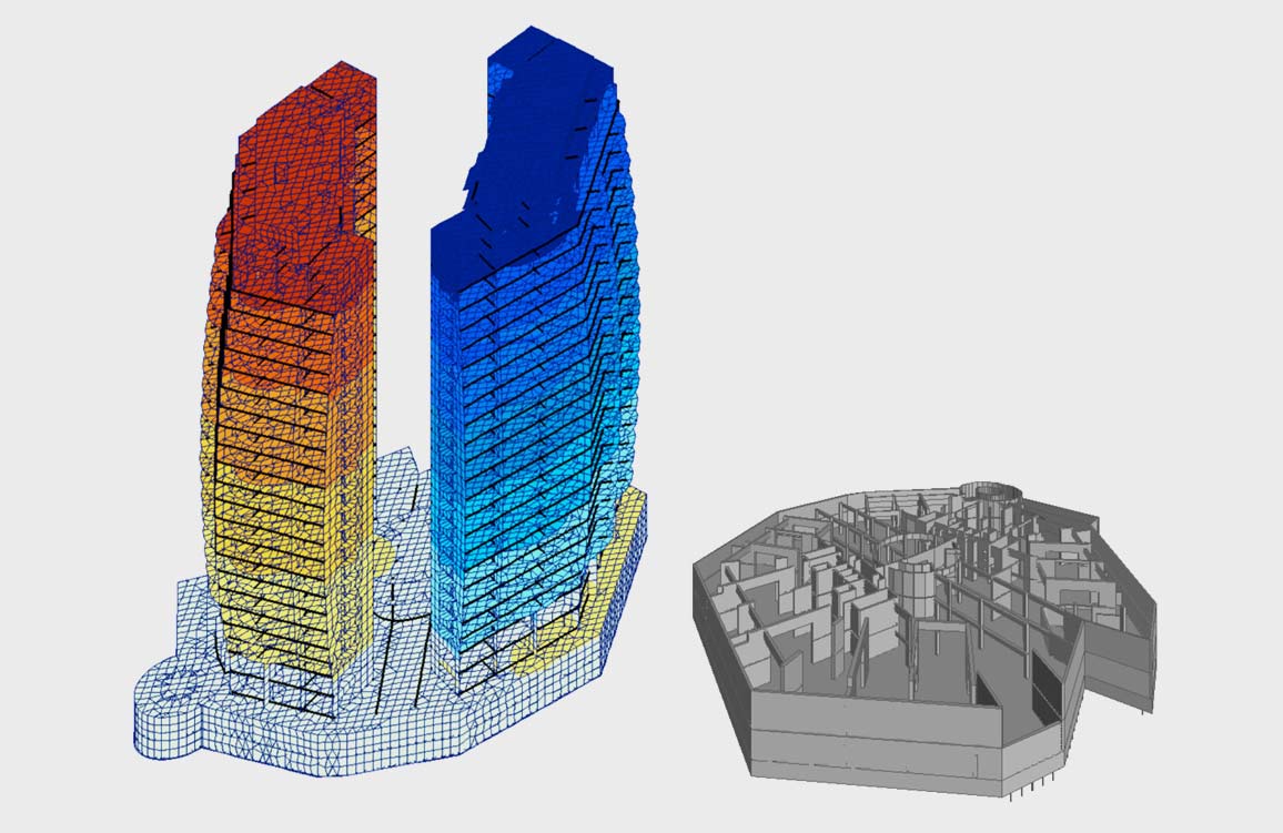 Конструктивная схема здания представляет собой монолитный каркас, состоящий из стен, колонн, плит и балок. Фундамент - монолитная плита на свайном основании, сваи буронабивные. Здание представляет из себя две 25-ти этажные секции, которые опираются на стилобатную 2-х этажную часть.
