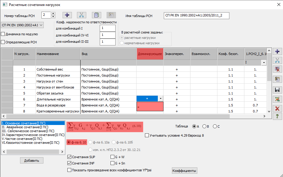 Для формирования основных сочетаний РСН в ВИЗОР необходимо выбрать таблицу (А, В или С). В зависимости от выбранной таблицы имеется возможность выбрать формулу для основных сочетаний: для таблицы А может быть только формула 6.10, для таблиц В и С можно выбрать любую из формул 6.10, 6.10а или 6.10b. Отдельно можно указать признак формирования сочетаний с благоприятными и неблагоприятными нагрузками. В соответствии с СП РК EN 1990:2002+A1:2005/2011 (и во всех нормах на базе Еврокодов) можно задать шесть типов сочетаний РСН: основные, аварийные, сейсмические, характеристические, частые и квазипостоянные. Для выбранной строки сочетаний отображается соответствующая формула и ее номер.