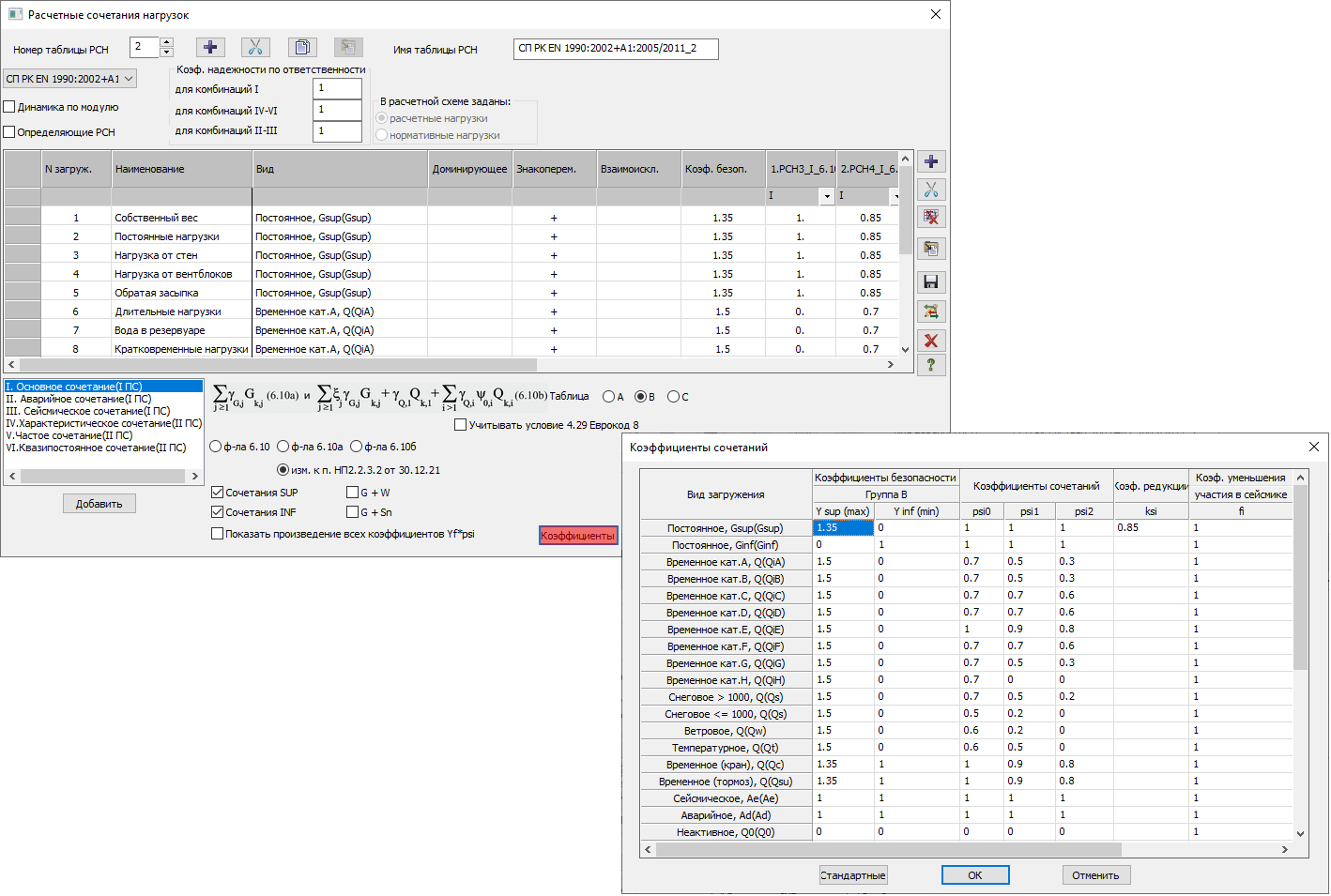 Также для норм СП РК ЕN 1990:2002+А1:2005/2011 в LIRA-FEM добавлены дополнительные настройки для автоматического формирования комбинаций нагрузок: