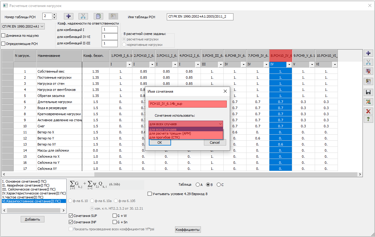 Для основных сочетаний в зависимости от выбранной формулы (6.10, 6.10а или 6.10b) возле списка сочетаний отображается сама формула и ее номер. Основные сочетания могут быть заданы только по одной формуле в одной таблице РСН (в LIRA-FEM есть возможность создания нескольких таблиц РСН, расчет на которые может быть выполнен в разных вариантах конструирования).