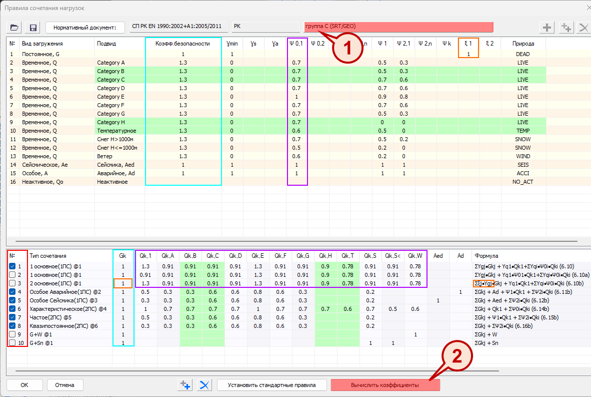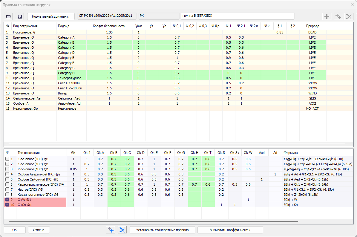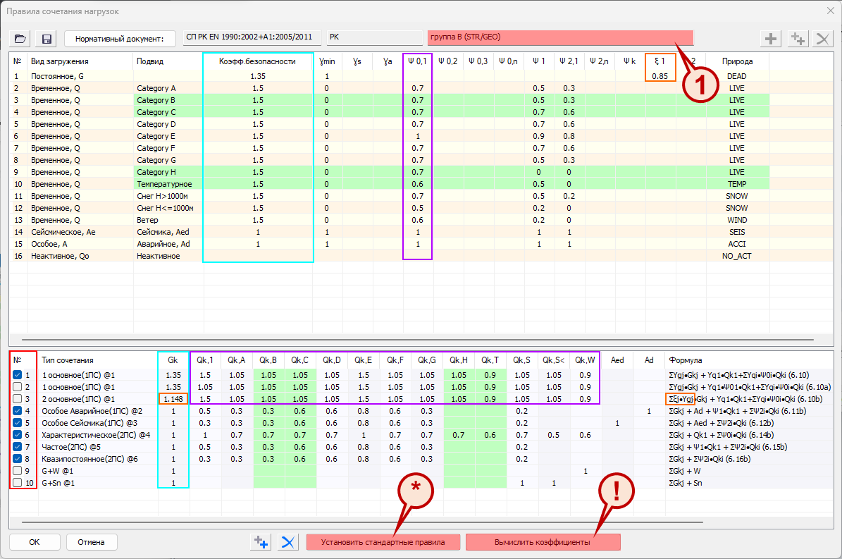 С учетом принятых умолчаний (или с учетом исправлений пользователя: изменить можно и коэффициент безопасности, и любой из коэффициентов сочетания) по нажатию кнопки «Вычислить коэффициенты» (!) происходит умножение Y*И и заполняется нижняя таблица коэффициентов сочетаний для загружений всех подвидов/категорий, которые затем используются в комбинаторике. По нажатию «Установить стандартные правила» (*), происходит возврат программных умолчаний (сброс до «заводских настроек»).
