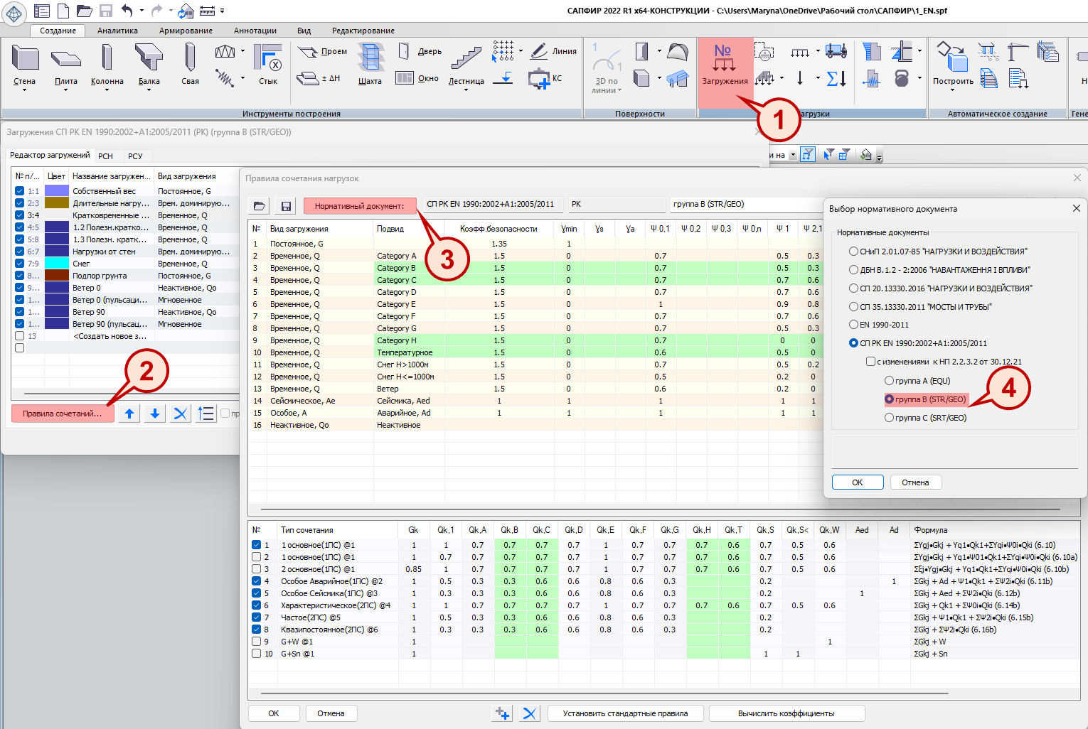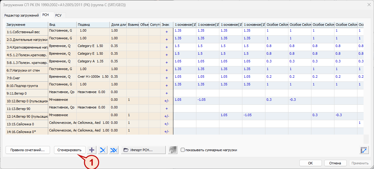 В LIRA-FEM в препроцессоре LIRA-CAD процесс задания сочетаний по нормам СП РК EN 1990:2002+A1:2005/2011 автоматизирован: