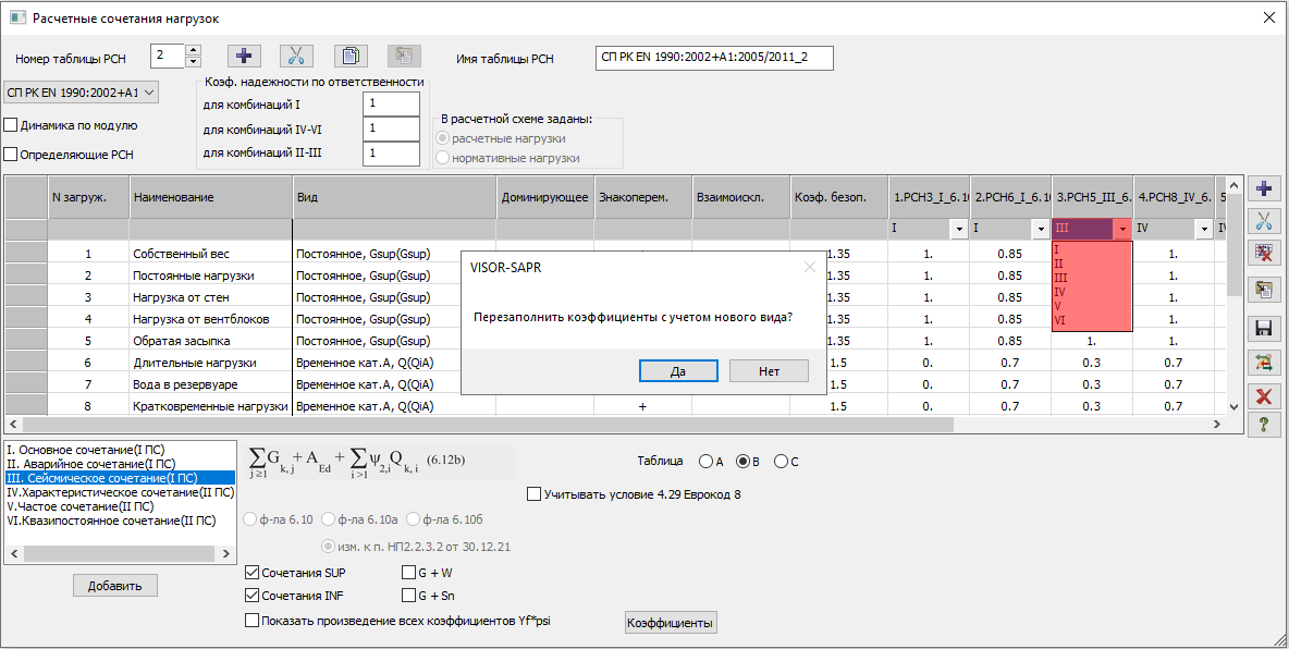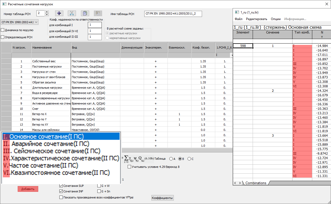 В РСН по европодобным нормам (в том числе СП РК EN 1990:2002+A1:2005/2011) – каждая комбинация имеет свое предназначение. Таким образом результат расчета таблицы РСН по EN – единая таблица с указанием: какая комбинация для чего нужна (в нашем случае это римские значения от I до VII).